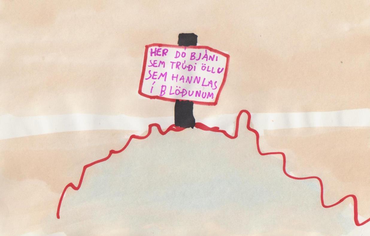 skiltinu stendur: HÉR DÓ BJÁNI SEM TRÚÐI ÖLLU SEM HANN LAS