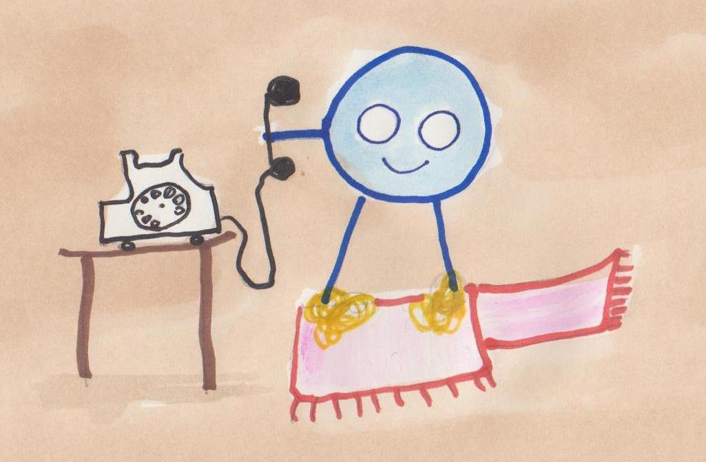 Tak runs to the phone, but the rug is glued to his feet and he drags it along. (gólf-teppi (carpet)/ gólf-motta is smaller (rug))