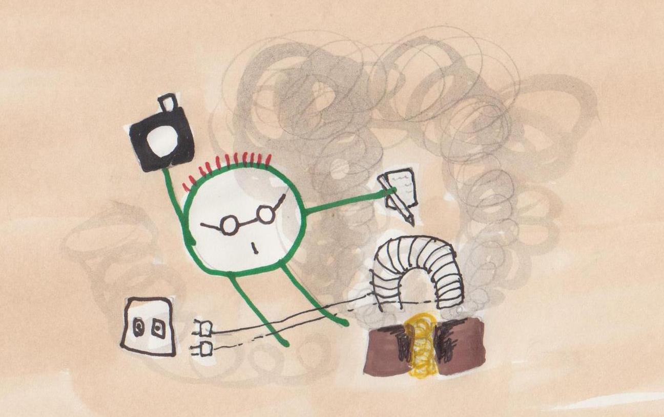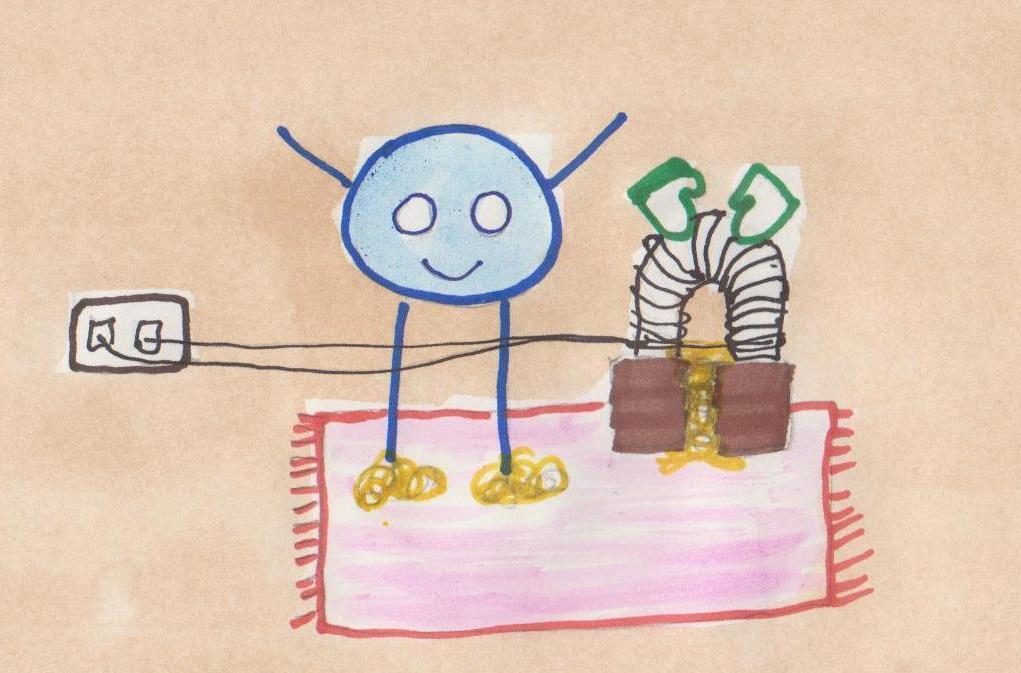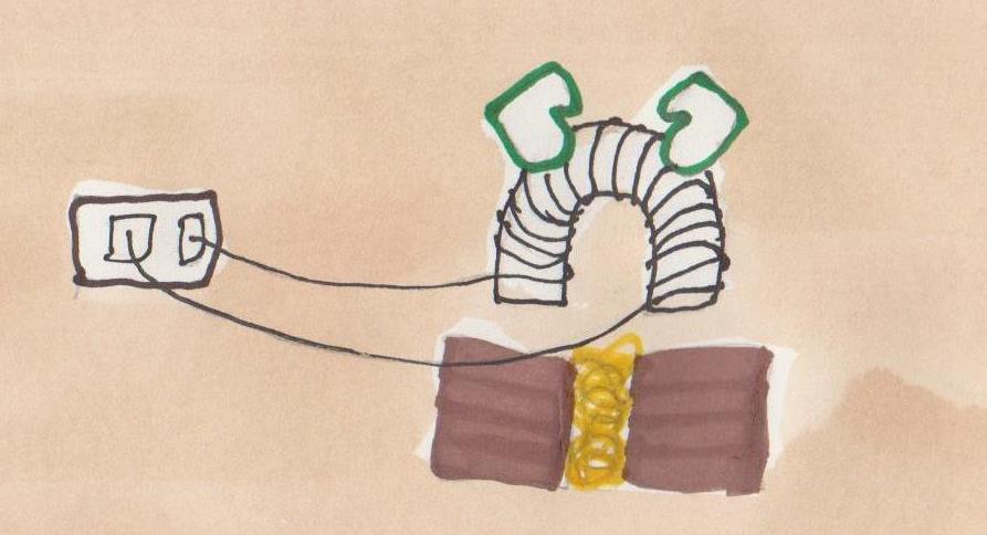Tak setur á sig einangrandi logsuðuhanska. Svo vefur Tak stóran og öflugan rafsegul. Rafseguláhrifin eru til þess að límið grípi. Þá skrifar hann R á töfluna. R fyrir rafáhrifin á límið.