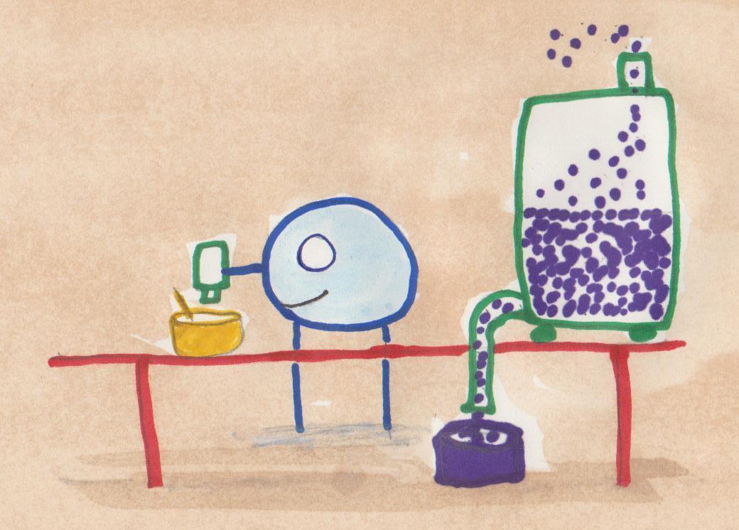 Tak er á efnarannsóknastofunni sinni. Tak er að reyna að búa til nýja tegund af lími. (leikhljóð: blásið í drykkjarrör í vatnsglasi alveg uppi við hljóðnemann)