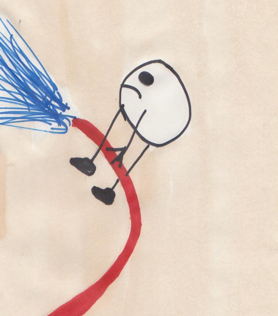The Evil-alien: -Can I now ? He pumps fire extinguishing foam from a black fire hose. He is going to extinguish the fire. But he does not notice that there is a hole on the hose. The foam splashes out in a wrong place.