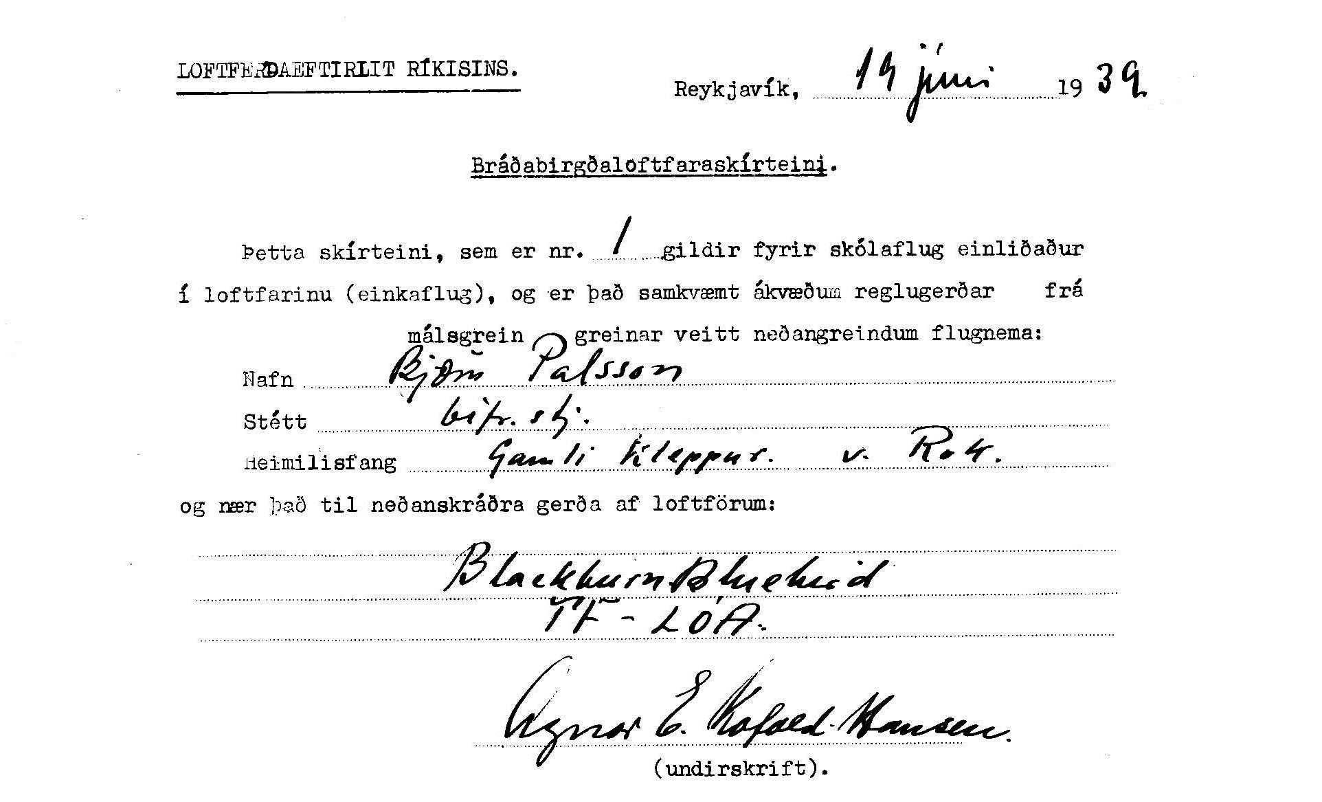 Hlut í fyrstu flugvél sinni eignaðist faðir minn árið 1937 og hann var fyrstur manna til þess að öðlast réttindi einkaflugmanns á Íslandi vorið 1939. Af takmörkuðum efnum keypti hann árið 1948 af eigin rammleik, litla eins hreyfils flugvél og hugðist stunda atvinnuflug með henni ásamt brauðstritinu við húsbyggingar.