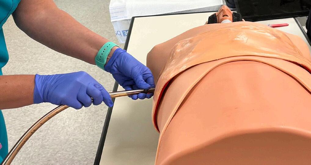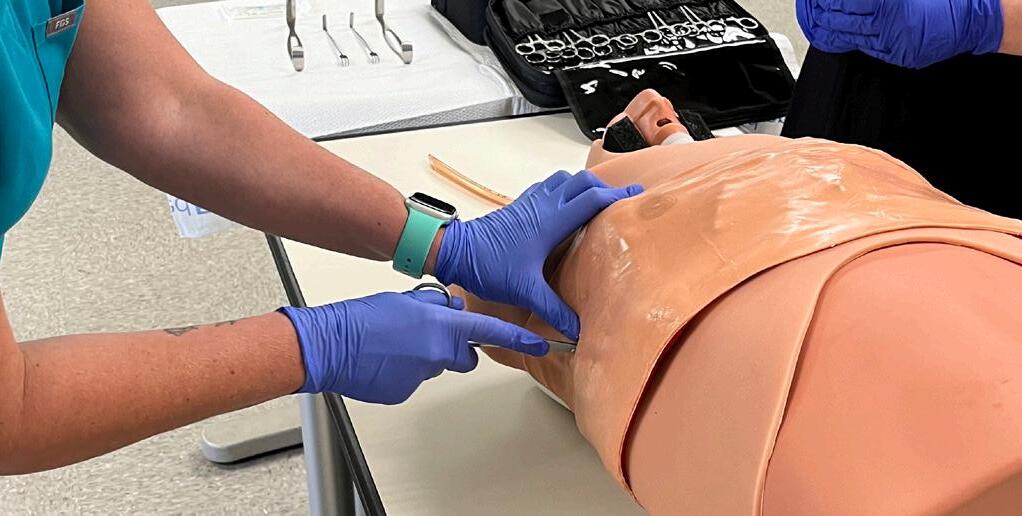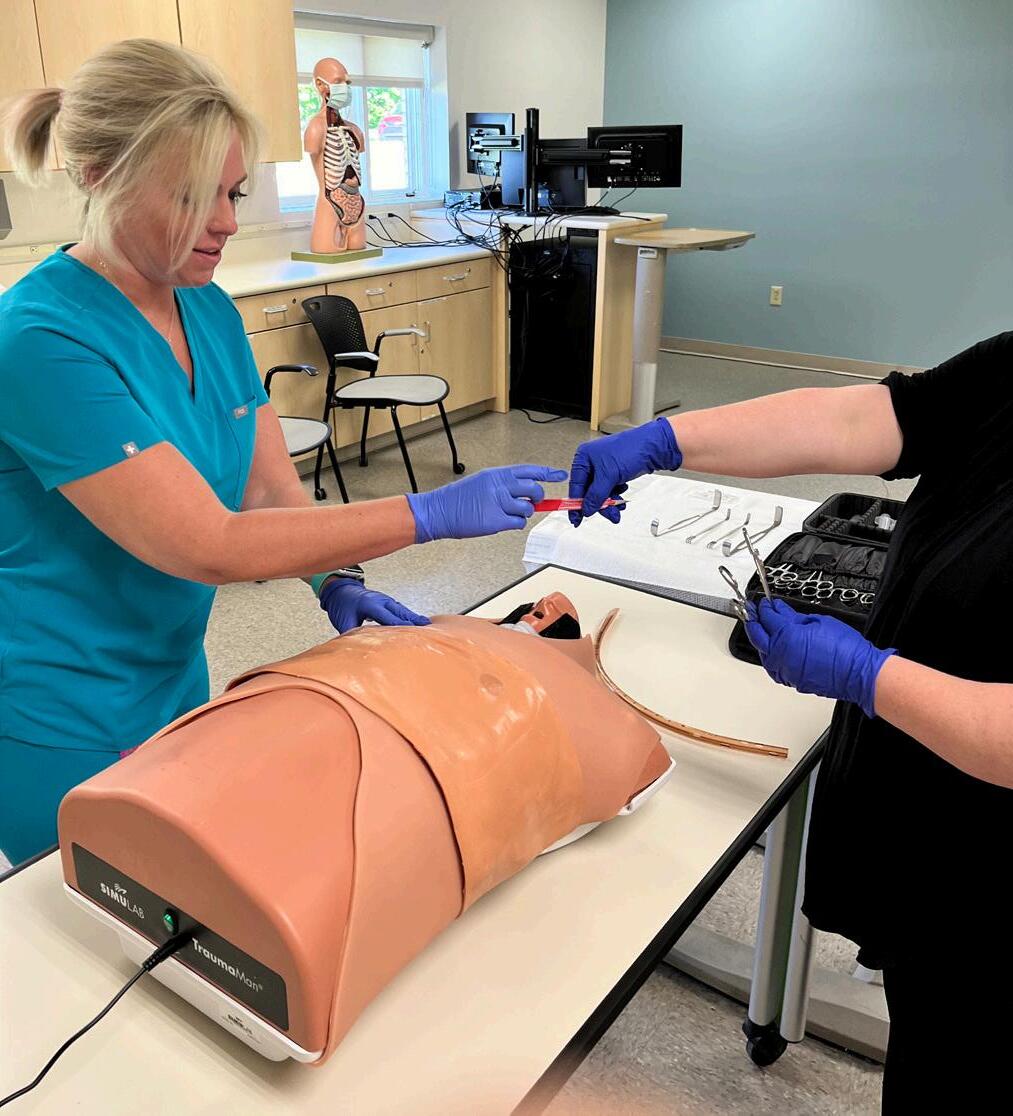 Surgical resident Kristen Wahlen, DO, demonstrates on TraumaMan.
