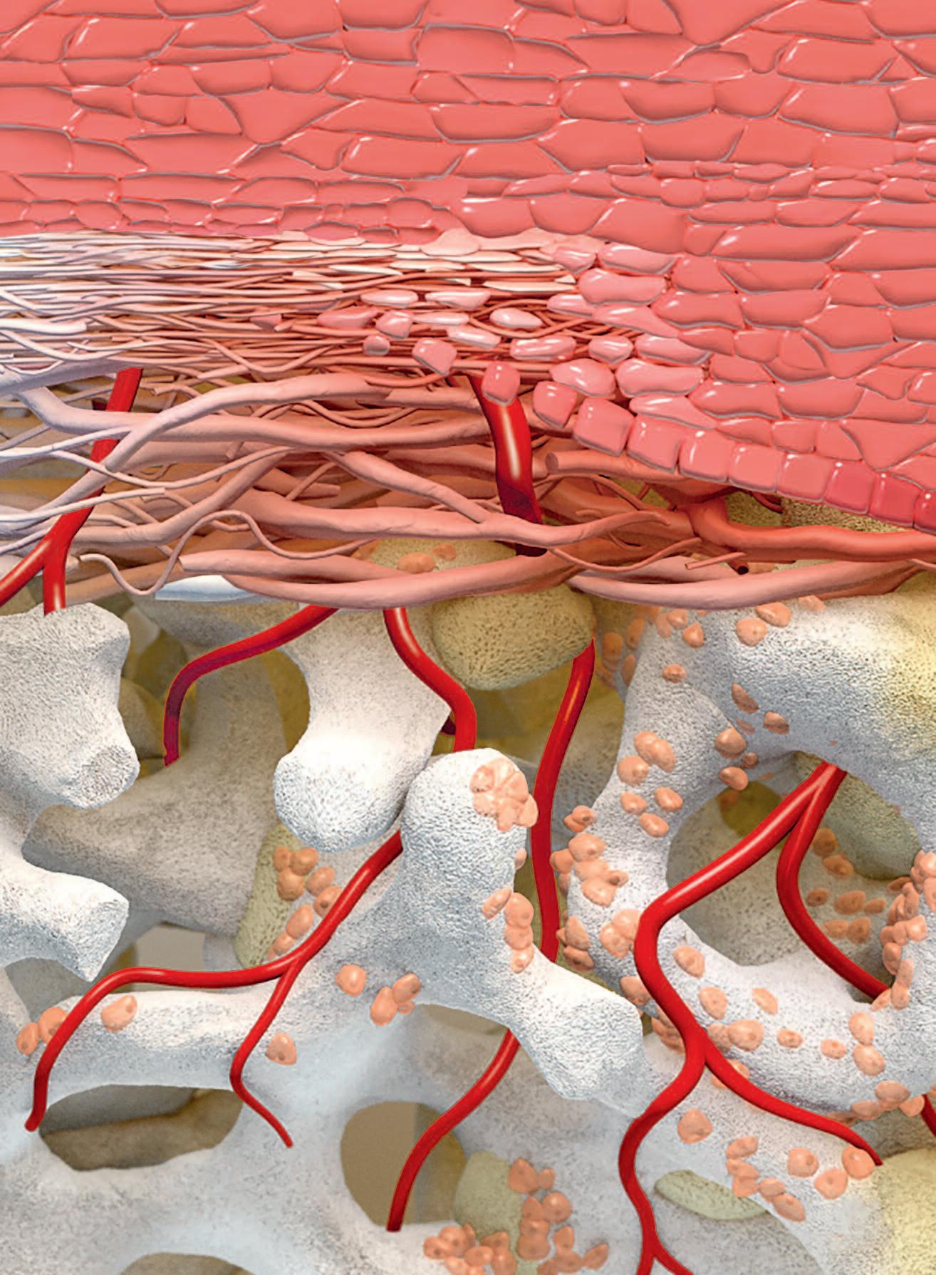 Die native Kollagenmembran Geistlich Bio-Gide® wird in das heilende und sich neu organisierende Gewebe integriert 1 und förder t schnel ler als andere Membranen die Ausbildung einer neuen Periostschicht 3 . Das sich zwischen Weichgewebe und dem regenerierenden Knochen bildende Periost dient der Ernährung des Knochens und dem Aufbau seiner physiologischen Funktionen und Gesundheit.