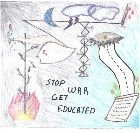 Ζωγραφικό έργο των μαθητριών Δώρας Χριστάκη, Αγγελικής Ψαλτάκηκαι Μαρίας Συρβισαριώτη του τμήματος Γ2΄ με θέμα τον πόλεμο και τηνειρήνη
