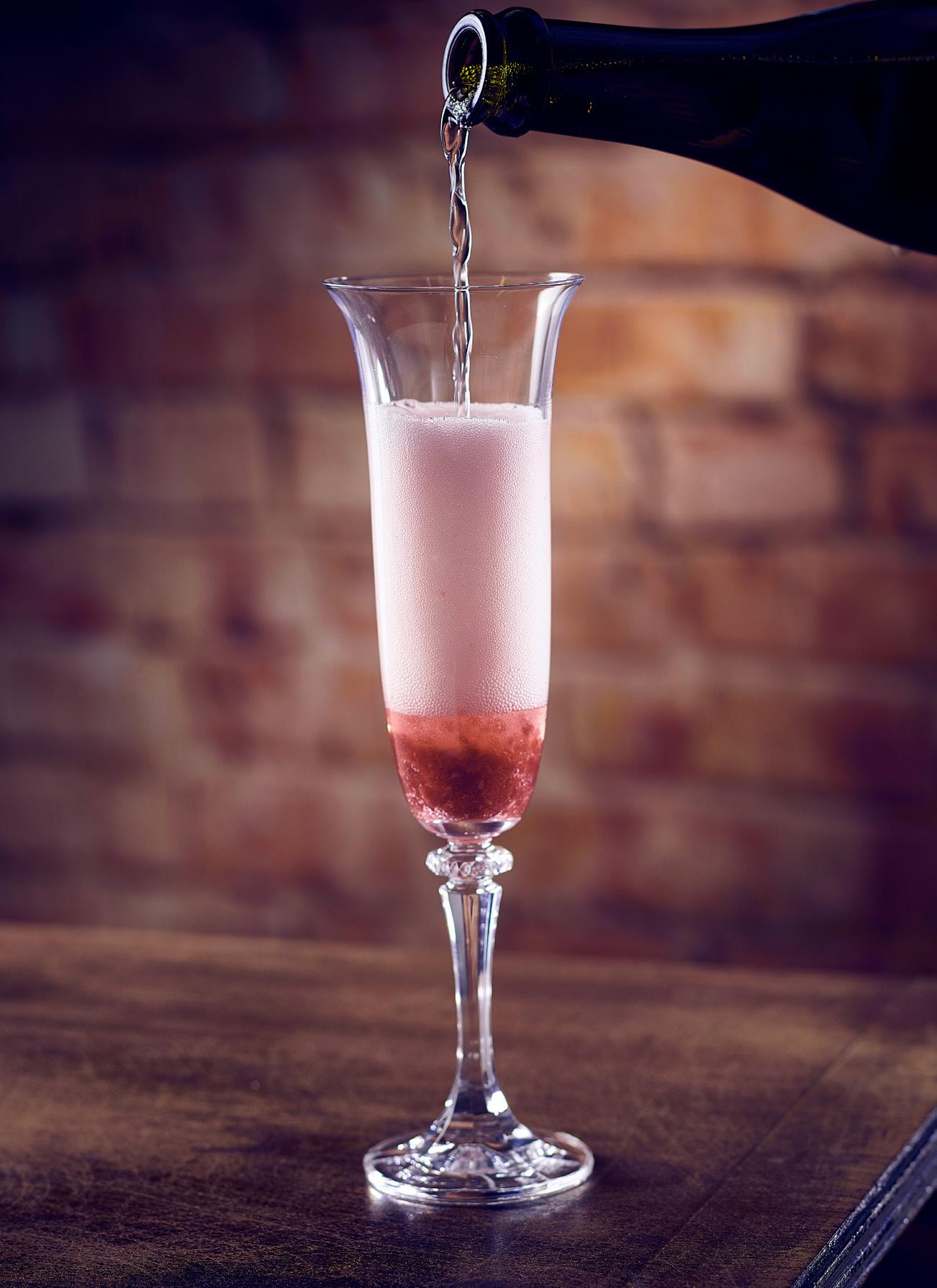 6 belliniberry Add one shot of vodka and a few berries to a champagne glass. Muddle to crush berries. Add chilled prosecco or champagne. 25ml Vodka 10 180mlBerriesChampagne or Prosecco