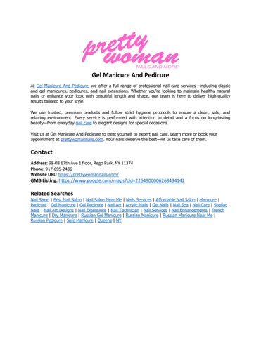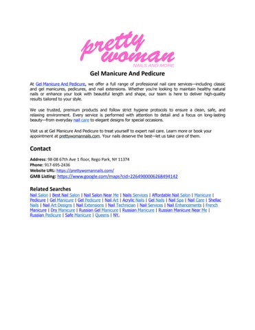 Phone: 917-695-2436 About Us: At Gel Manicure And Pedicure, we offer a full range of professional nail care services—including classic and gel manicures, pedicures, and nail extensions. Whether you're looking to maintain healthy natural nails or enhance your look with beautiful length and shape, our team is here to deliver high-quality results tailored to your style. We use trusted, premium products and follow strict hygiene protocols to ensure a clean, safe, and relaxing environment. Every service is performed with attention to detail and a focus on long-lasting beauty—from everyday nail care to elegant designs for special occasions. Visit us at Gel Manicure And Pedicure to treat yourself to expert nail care. Learn more or book your appointment at prettywomannails.com. Your nails deserve the best—let us take care of them. Related Searches: nail salon| best nail salon| nail salon near me| nails services| affordable nail salon| manicure| pedicure| gel manicure| gel pedicure| nail art| acrylic nails| gel nails| nail spa| nail care| shellac nails| nail art designs| nail extensions| nail technician| nail services| nail enhancements| french manicure| dry manicure| russian gel manicure| russian manicure| russian manicure near me| russian pedicure| safe manicure| Queens| NY| Additional Details Hours: Monday to Friday 9:30 am–8:00 pm Saturday Closed Payment Accepted: CC, cash GMB Listing https://www.google.com/maps?cid=2264900006268494142