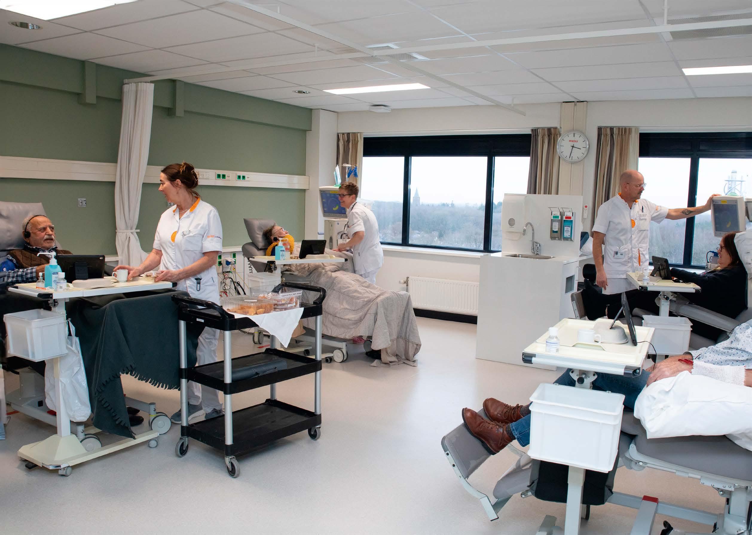 Sinds 2004 werken in Gelre ziekenhuizen verschillende beroepsgroepen samen in het Dialysecentrum. De patiënten komen hier minimaal 3 keer per week en dat vaak voor jaren lang. De gezellige sfeer is dan ook heel belangrijk voor deze afdeling. Naast de dialyse via het bloed die je op de foto ziet, is het ook mogelijk om te dialyseren via het buikvlies. Per patiënt wordt gekeken of deze in aanmerking komt voor een niertransplantatie.