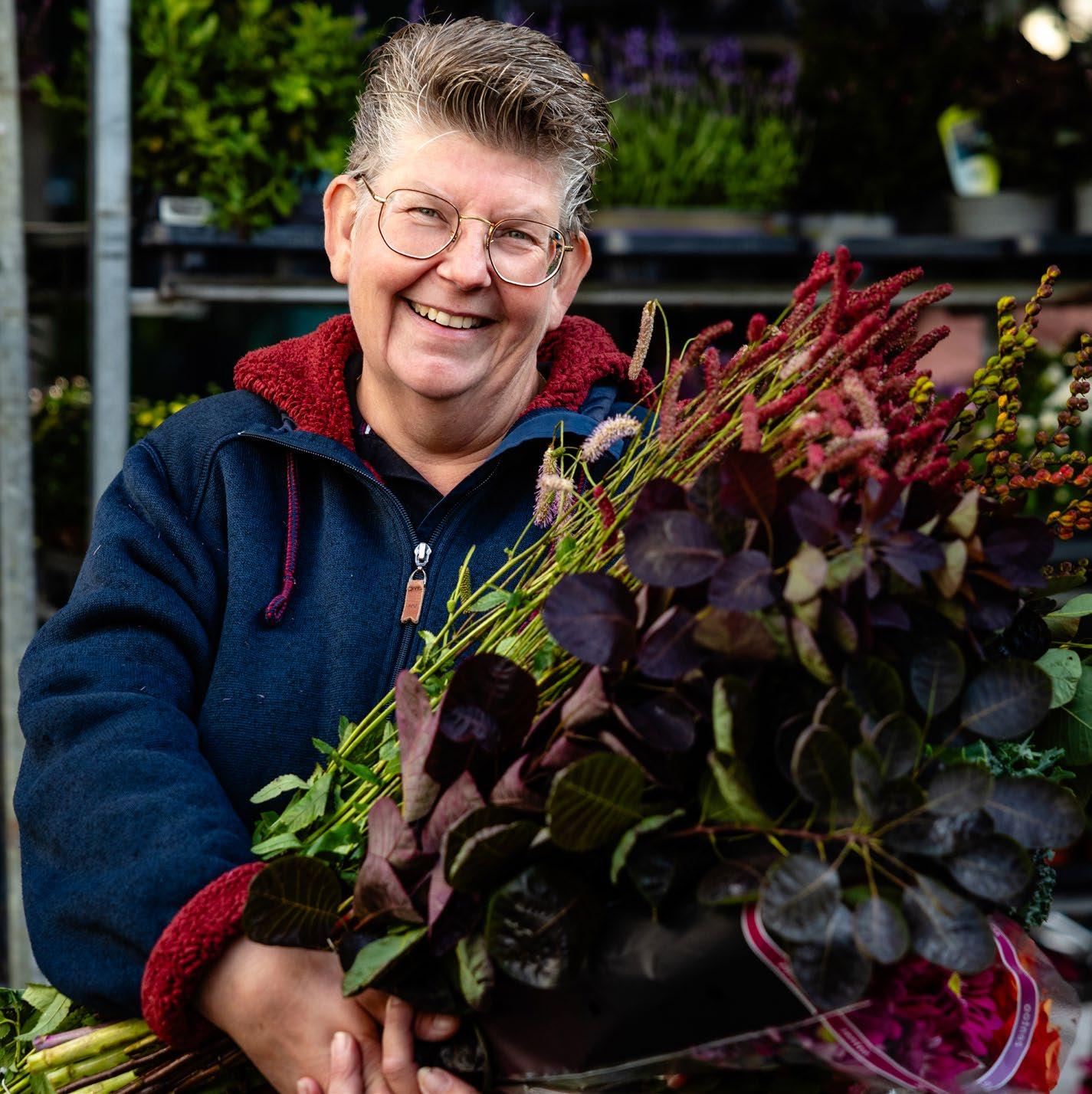 zien. We hebben veel vaste klanten. Na verloop van tijd bouw je een band met ze op. Ze maken altijd even een praatje, of ze nu iets nodig hebben of niet. Soms komen er ook klanten langs die vroeger al bij mijn opa aan de kraam stonden. Het sociale contact maakt het werk extra leuk. Ik vind het belangrijk dat er tijd is voor een praatje en dat mensen hun vragen kunnen stellen. Dit zie je in tuincentra tegenwoordig steeds minder. Het liefst werk ik natuurlijk in de zon, maar als je altijd buiten bent, hoort slecht weer er ook bij. Regen is vervelend, maar niet erg. Wind daarentegen is onvoorspelbaar. Dan kan het gevaarlijk worden. Ik heb wel eens een storm meegemaakt waarbij de kramen de lucht ingingen. Tegenwoordig kunnen we de kramen gelukkig vastzetten met ankers. Het weer schrikt me niet snel af, maar soms is stoppen de enige optie. Veiligheid staat altijd voorop.’