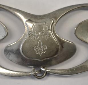 Decontourenvanhetgemeentewapenzijnuiteenplaatzilvervanca.1 mmgezaagd.Hiernaisdezeindepenninggesoldeerd.Totslotzijnhet hardschilddwarsbalk,lelie,spoorrad,schelpenlofwerkenedelstenen metdehandgegraveerd,inclusiefdearceringdiedeheraldische kleureninhetgemeentewapensymboliseren.Aandekeerzijdeishet Rijkswapengeslagen.