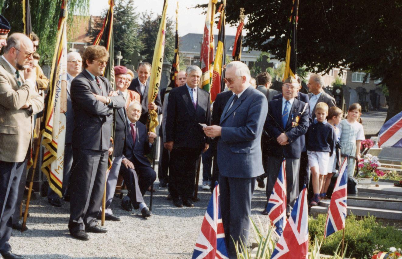 Op zaterdag 03 september 1994 wordt de 50 e verjaardag van de bevrijding groots herdacht. Frank Cunningham, links vooraan, is eregast. Hij raakt als soldaat bij gevechten tijdens de bevrijding in 1944 zwaargewond en krijgt in het gemeentehuis de eerste zorgen toegediend door onder meer dokter Monbaliu, zittend in het midden. Rechts van de spreker burgemeester Roger Terryn is André Verhaeghe te zien.