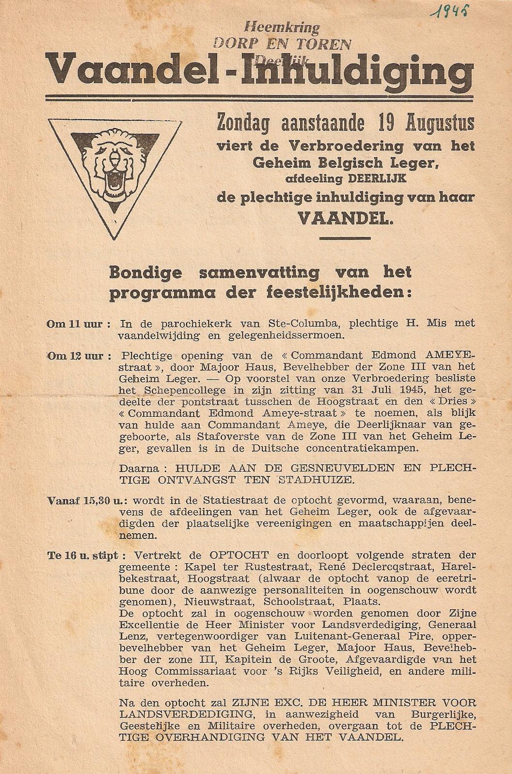 Vanaf augustus 1943 is er ook in Deerlijk een groep van het Geheim Leger actief. Deze groep maakt deel uit van de sector Waregem, die op zijn beurt valt onder de Zone III (in 1944 West- en Oost-Vlaanderen). Een leidinggevende van deze zone is Edmond Ameye, afkomstig uit Deerlijk. Hoewel deze in een Duits concentratiekamp overleden verzetsstrijder al jaren niet meer in onze gemeente woont, wordt uit eerbetoon in zijn geboorteplaats een straat naar hem vernoemd: de Commandant Edm. Ameyestraat. Deze straat wordt ingewijd op 19 augustus 1945. Nadien is er een stoet met lokale en andere verzetslui en verenigingen. Ameye is niet meer gedomicilieerd in Deerlijk bij zijn overlijden, dus staat hij niet op het oorlogsmonument.