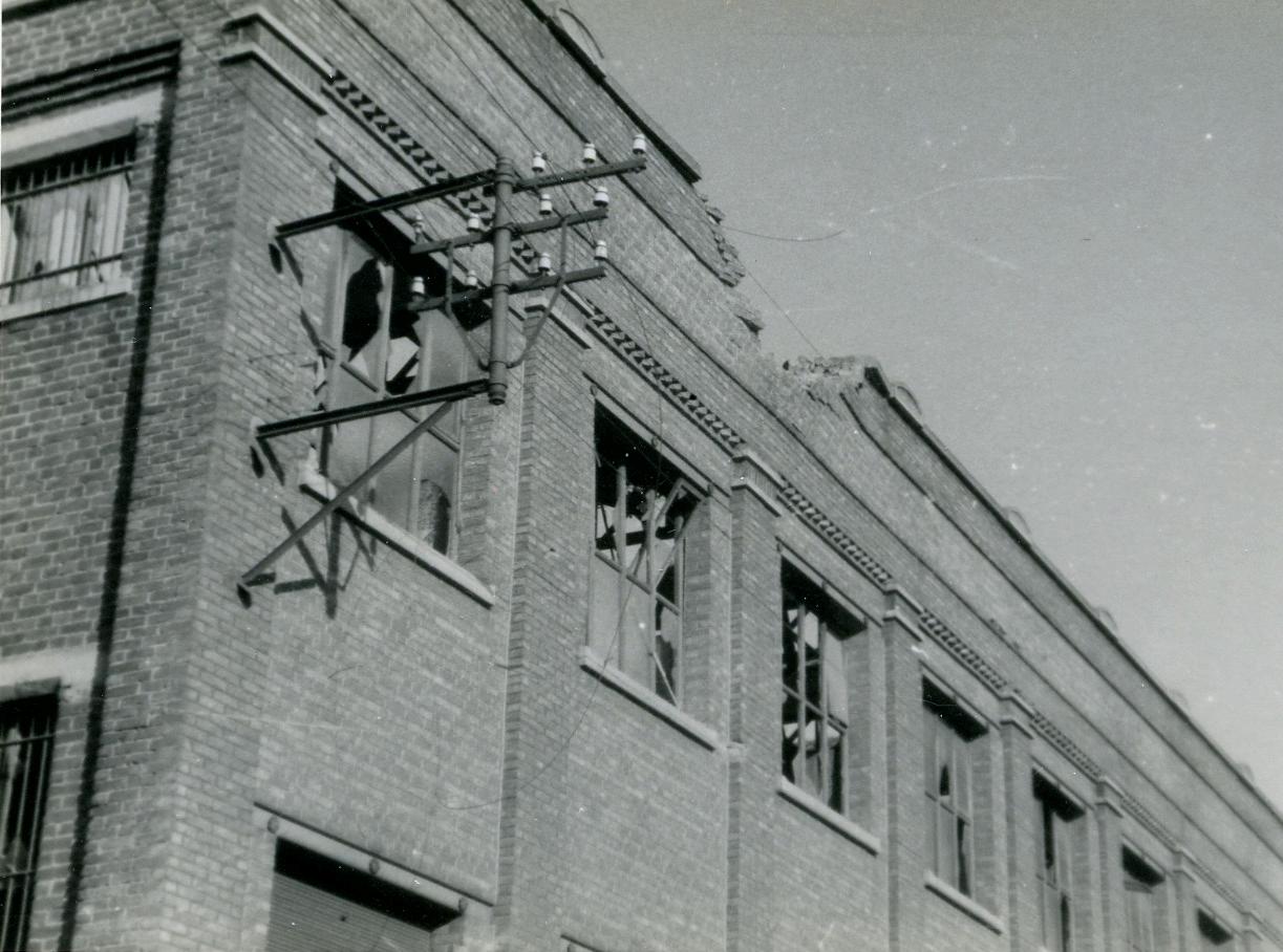 De schade aan de kroonlijst van de gebouwen van de Ets. Defraeye in de toenmalige Pontstraat. Zowel in 1940 als in 1944 gebouwen bij beschietingen schade op.