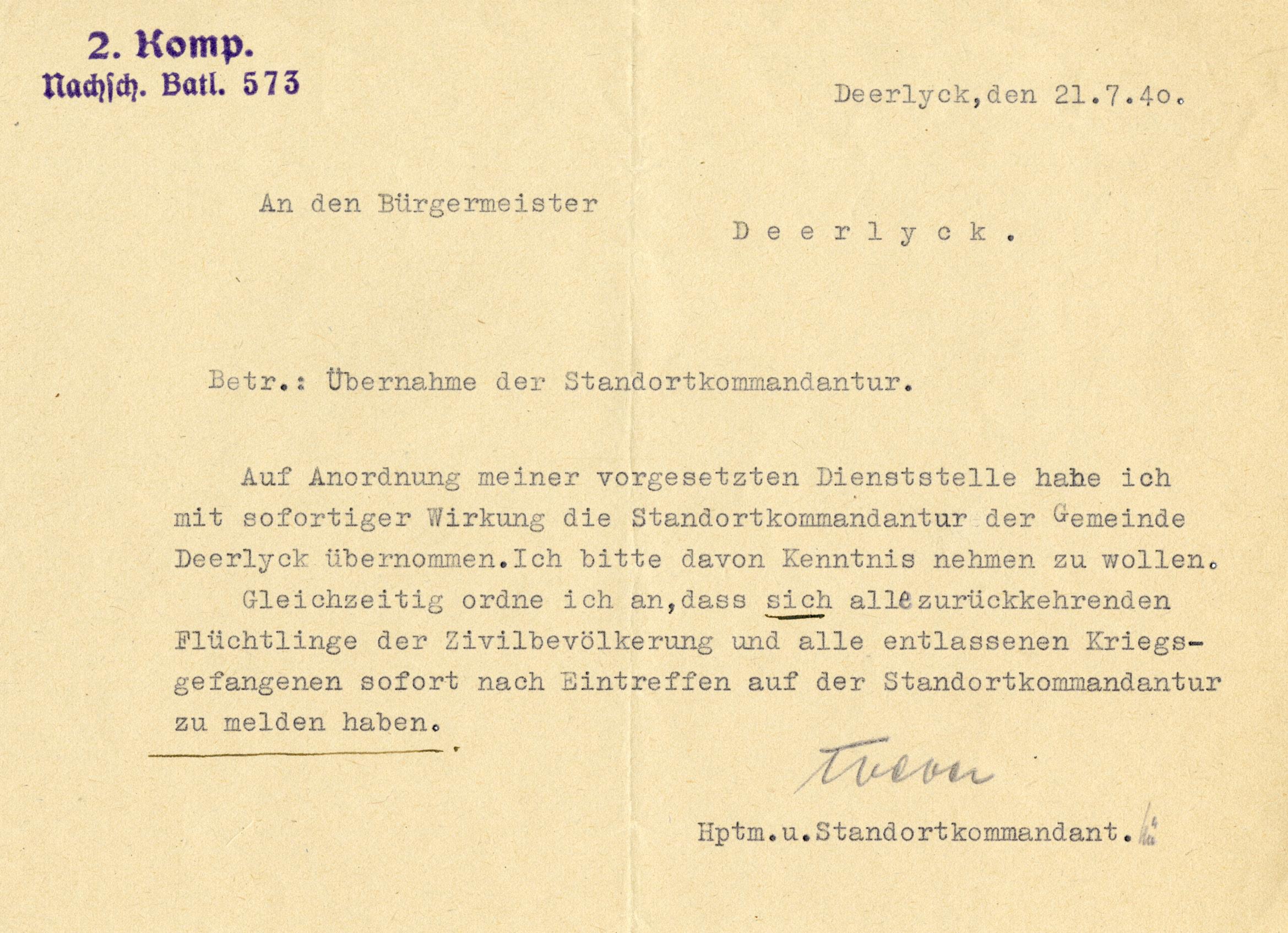 Opnieuw ging ons land een lange Duitse bezetting tegemoet. Hoewel de vooroorlogse burgemeester Joseph Devos op post mocht blijven (bijna tot op het einde van de bezetting), installeerden de Duitsers – zoals in de meeste gemeenten – ook in Deerlijk een Ortskommandantur. Dat was een plaatselijke militaire bevelpost met aan het hoofd een Ortskommandant, de lokale militaire bevelhebber. Vanuit dit bureau werden onder meer verordeningen uitgevaardigd en controle uitgeoefend op de naleving ervan. Zo kwamen voedsel en andere benodigdheden op de bon. Een rantsoeneringsdienst reikte maandelijks zegels uit. Lange rijen mensen stonden aan te schuiven om hun rantsoen te bekomen. Sommigen hadden daar snel iets op gevonden: er werd van alles aangeboden op de zwarte markt en gesmokkeld. Er werd ook heel wat gestolen. De bezetter trad hiertegen echter hard op.