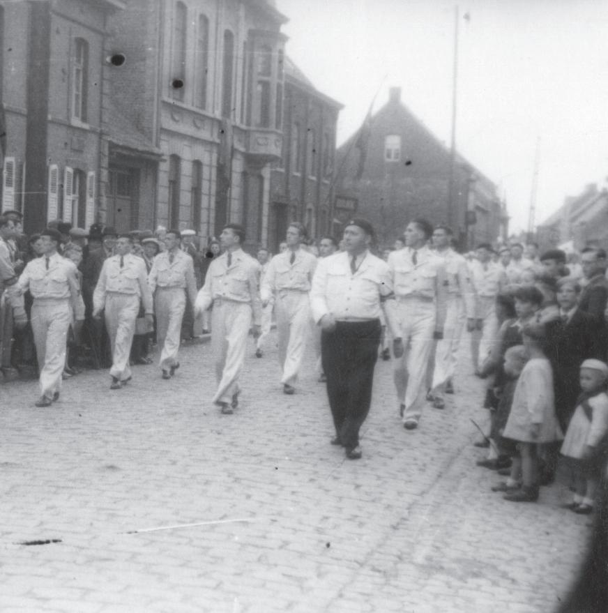 Optocht ter gelegenheid van de Vaandel-Inhuldiging van de Geheim Belgisch Leger, afdeling Deerlijk. De foto is genomen uren na de plechtige opening van de Commandant Edmond
