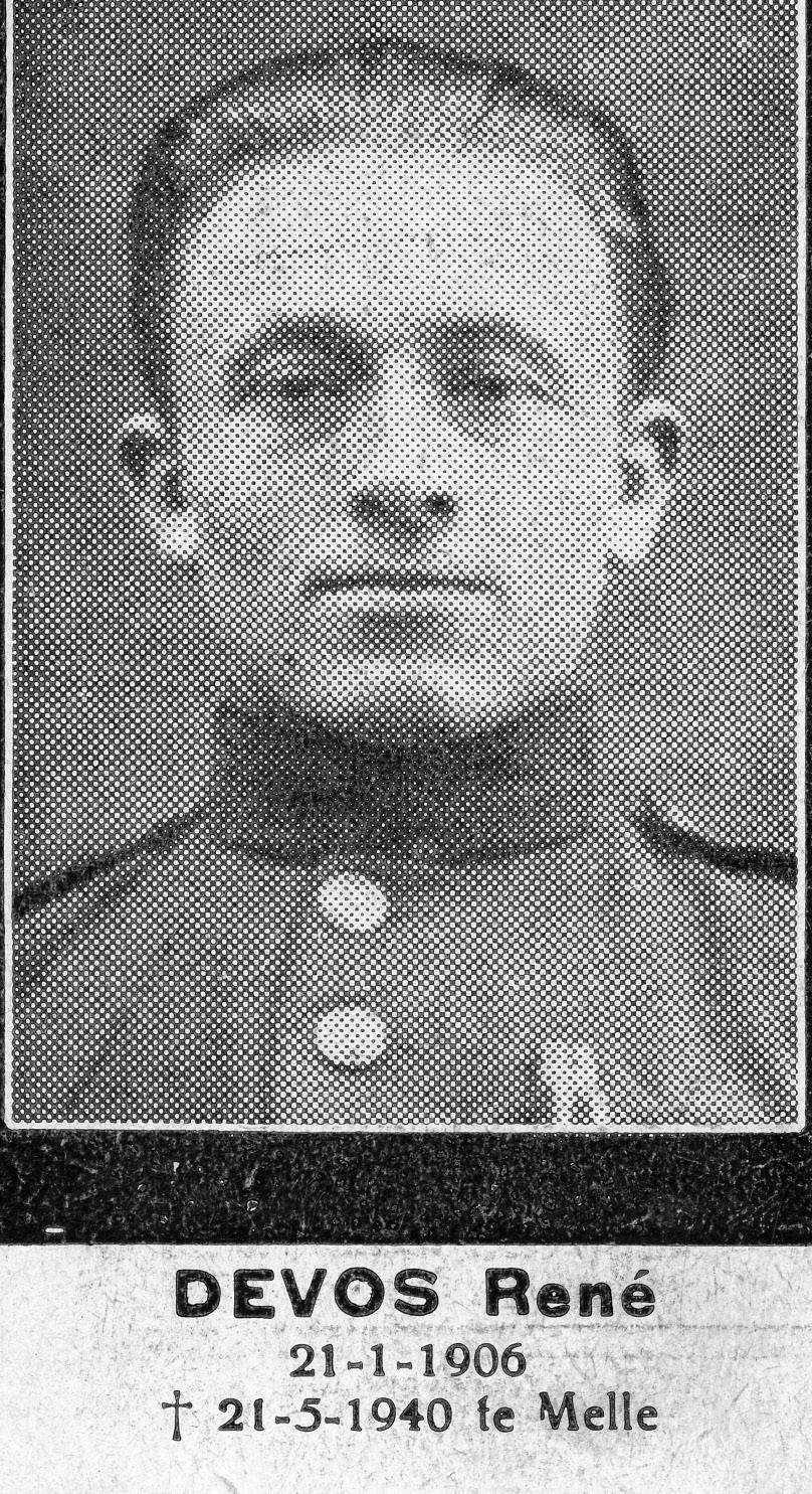 Daags nadien – op 21 mei – liet soldaat René Devos (°1906) het leven in Melle. Ook hij werd dodelijk getroffen door een granaat en ter plaatse begraven op het gemeentelijke kerkhof, om in 1965 opnieuw begraven te worden op de Belgische Militaire Begraafplaats van De Panne. René hoorde bij het 44 e Linie, een infanterieregiment. De infanterieregimenten zouden tijdens de Achttiendaagse Veldtocht de zwaarste verliezen incasseren. Beroepshalve was René wever.