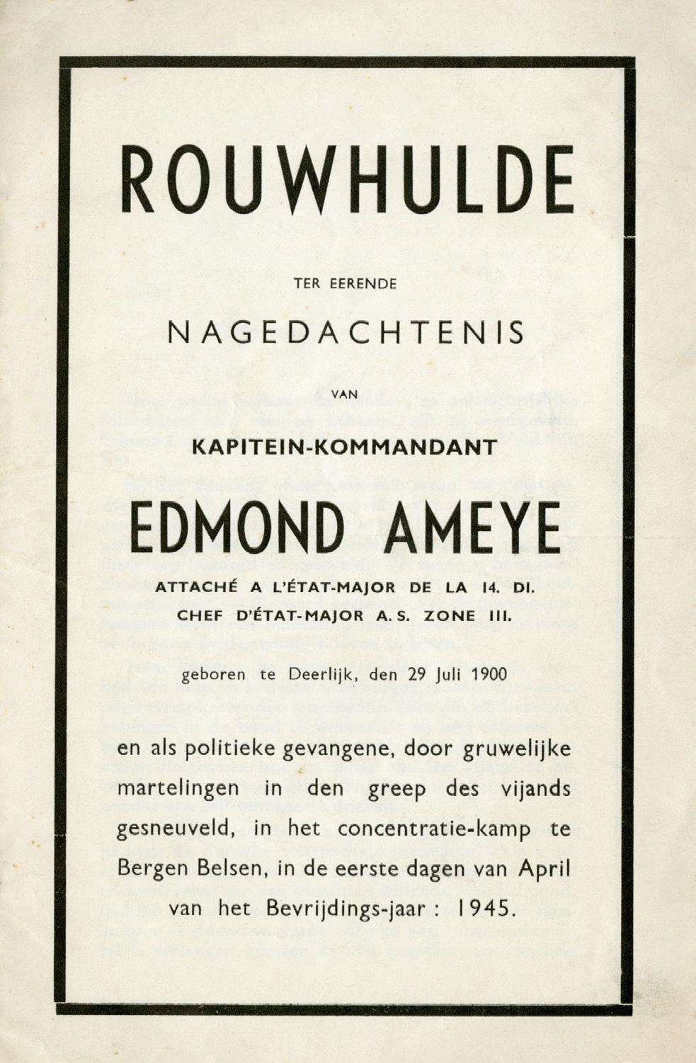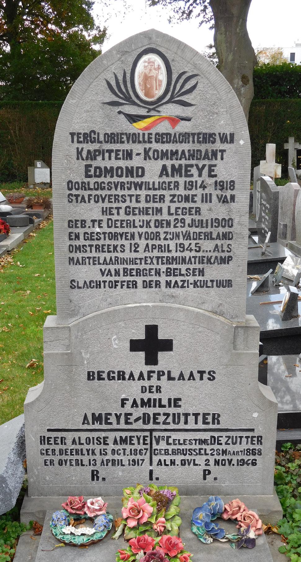 Graf van Edmond Ameye (gedeporteerde) Hoewel de naam van Edmond Ameye op het familiegraf staat, is hij er niet begraven. Zijn lichaam is vermoedelijk achtergebleven in een massagraf in het concentratiekamp van Bergen-Belsen, waar hij overleed. Het familiegraf ligt in Blok A, middenste rij (hoofdgang), perceel 271.