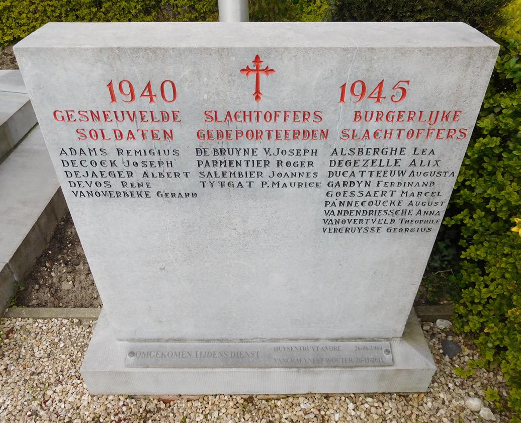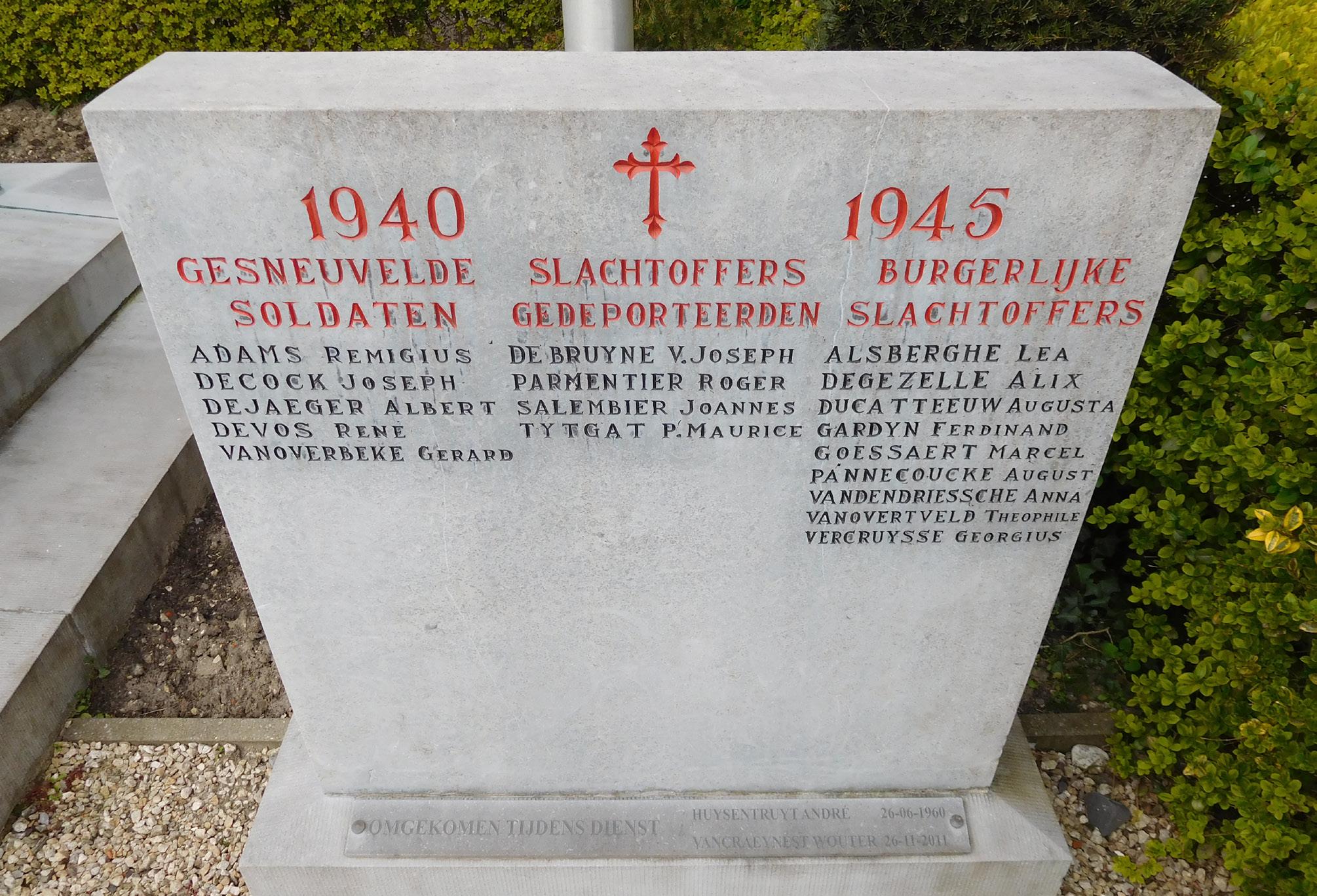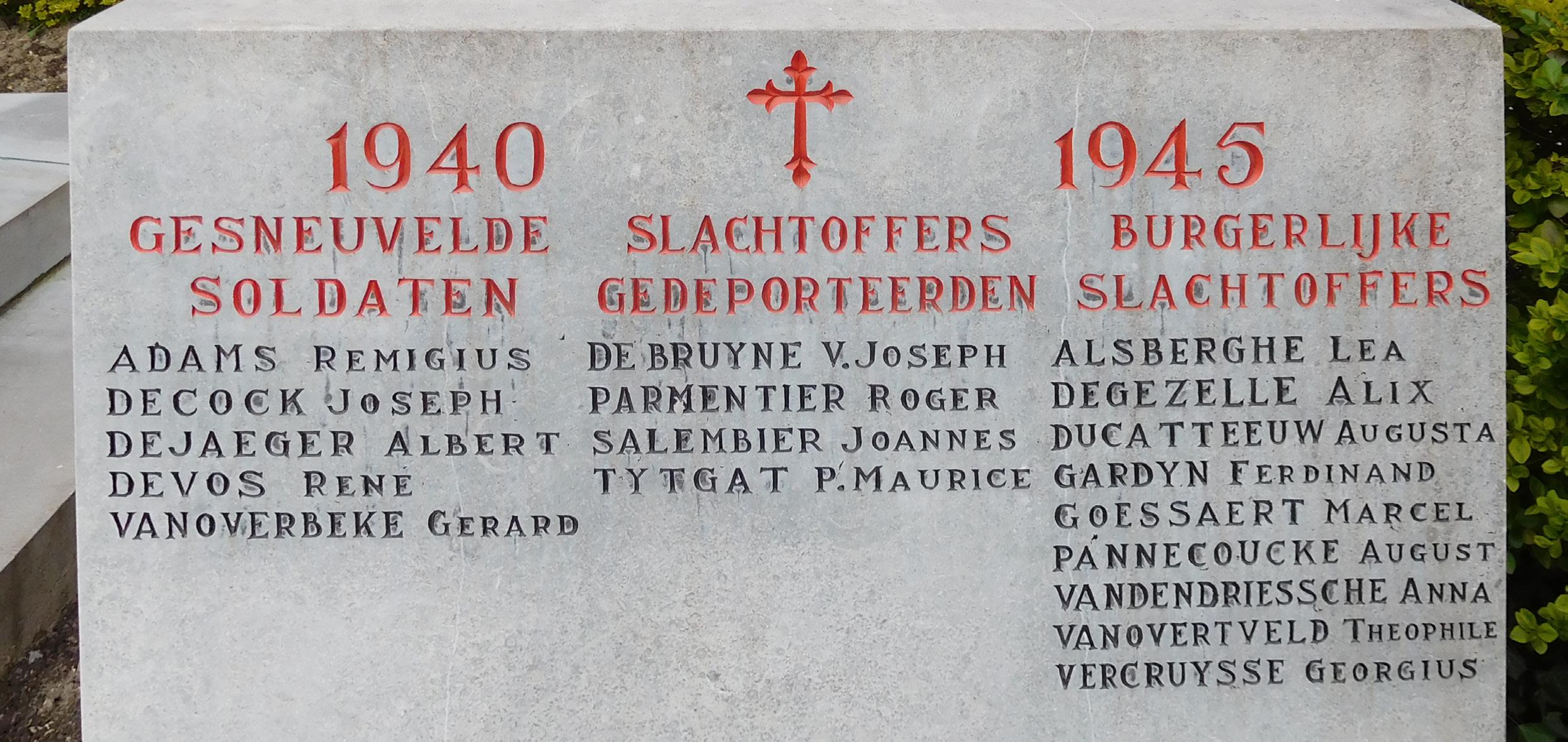 De namen van deze 18 onfortuinlijke personen staan op het oorlogsmonument aan de Sint-Columbakerk. De namen van de 2 militairen uit Sint-Lodewijk worden nog eens herhaald op het monument aldaar, aan de OnzeLieve-Vrouw Onbevlekt Ontvangen kerk.