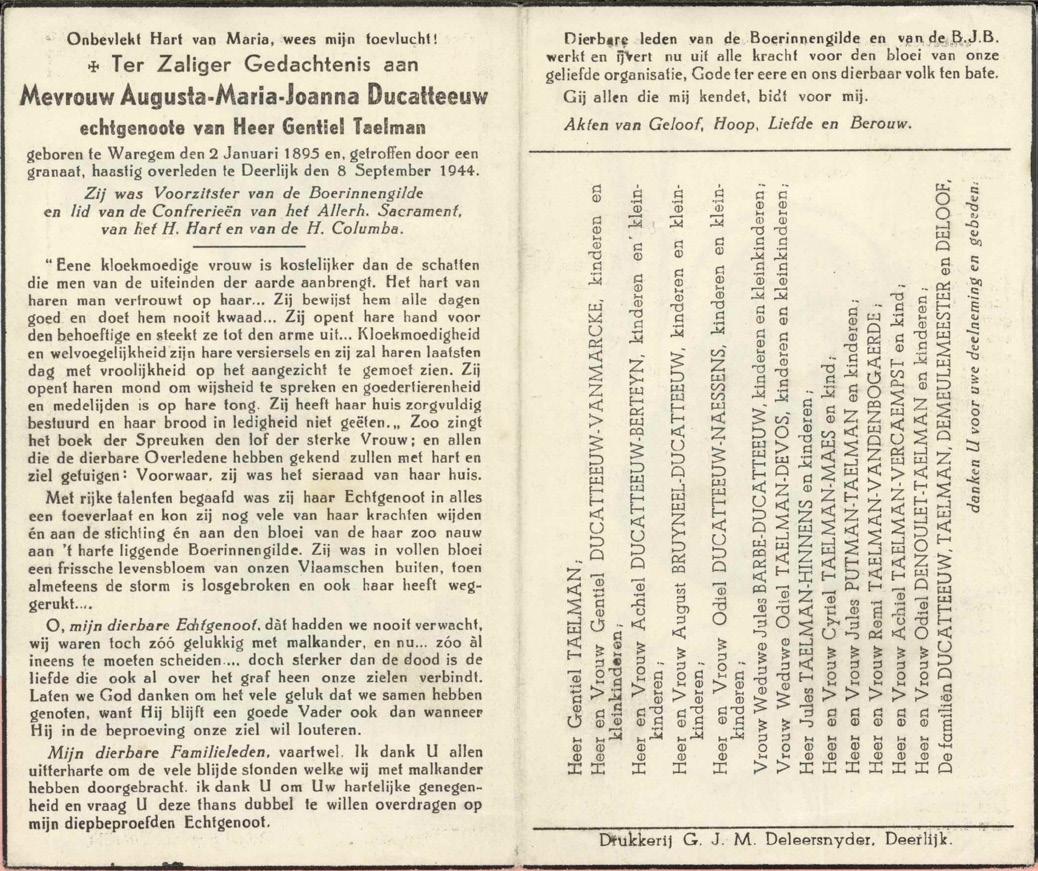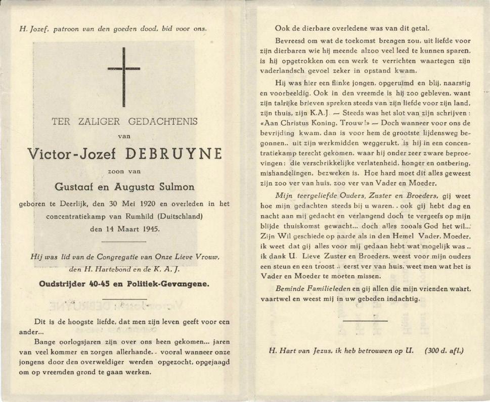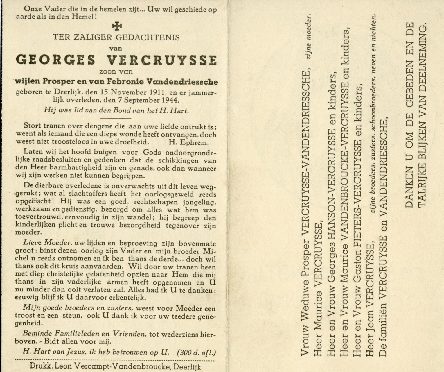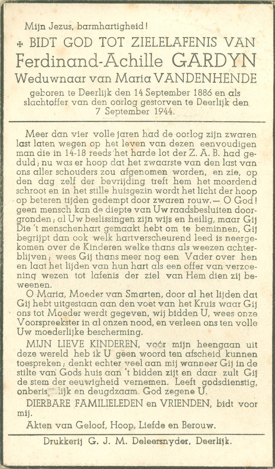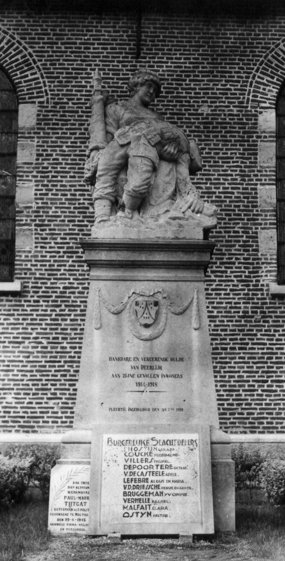 Ook Deerlijknaars werden rechtstreeks of onrechtstreeks door dit geweld getroffen. In mei 1940 waren er 7 doden (5 soldaten aan de diverse fronten en 2 burgers) te betreuren en in september 1944 nog eens 5 doden (allen burgers). In april 1943 en juli 1944 waren 2 burgers omgekomen. De bevrijding begin september 1944 luidde voor onze gemeente het einde van de bezetting in. Nog eens 4 gedeporteerde jongens hadden niet zoveel geluk en zouden nog maanden lijden in onmenselijke omstandigheden. Uiteindelijk zouden ze het niet overleven.
