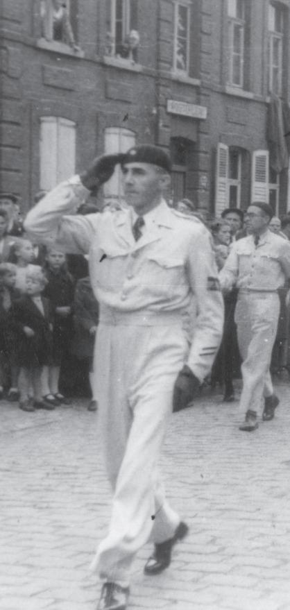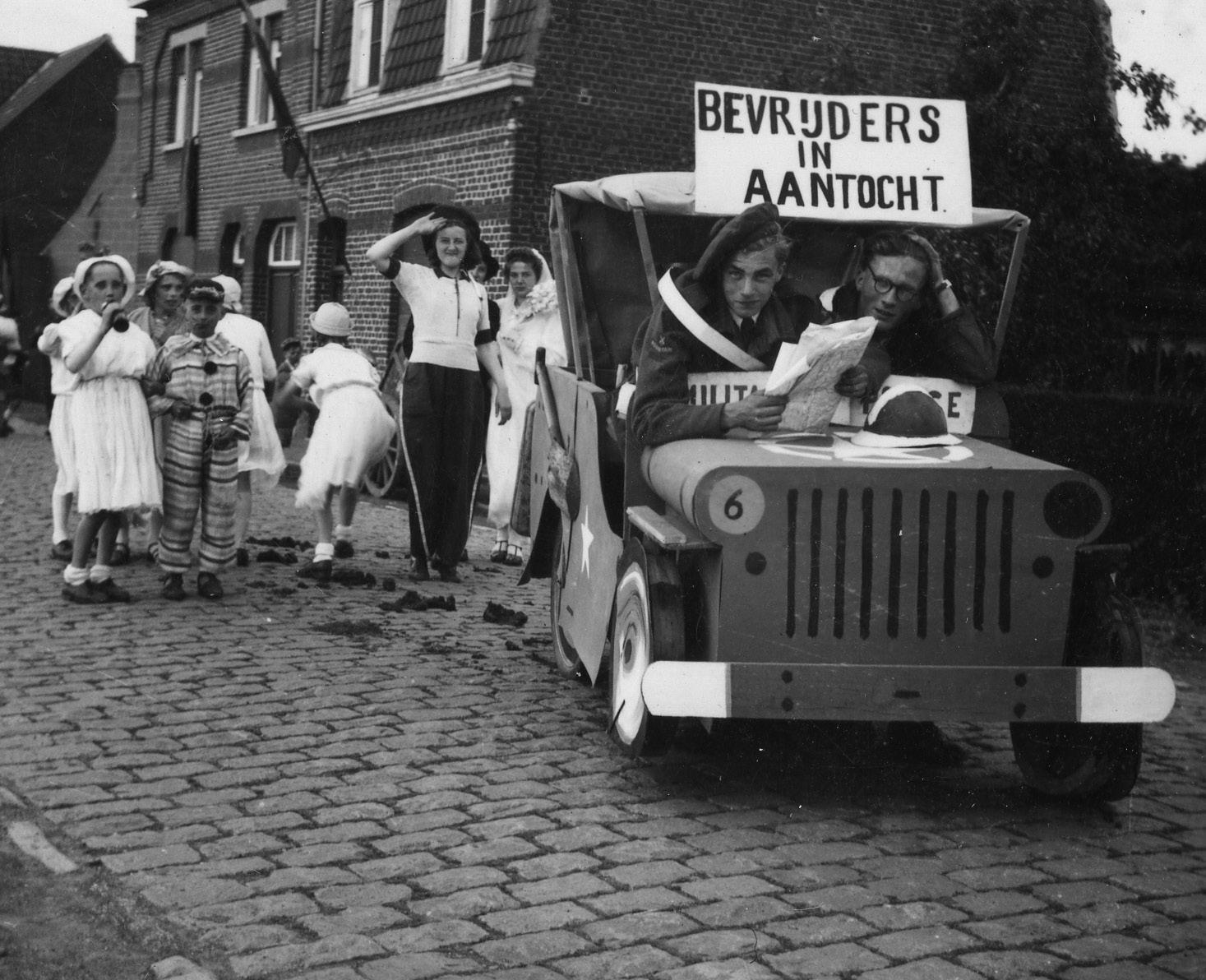In de stoet van Sint-Lodewijk staat in de Kapelstraat ter hoogte van het huidige huisnummer 107 een ‘jeep’ met ‘bevrijders’. Uiterst links op de achtergrond is nog net de thuis van Roger Verschuere te zien, voor wie de stoet uitging.