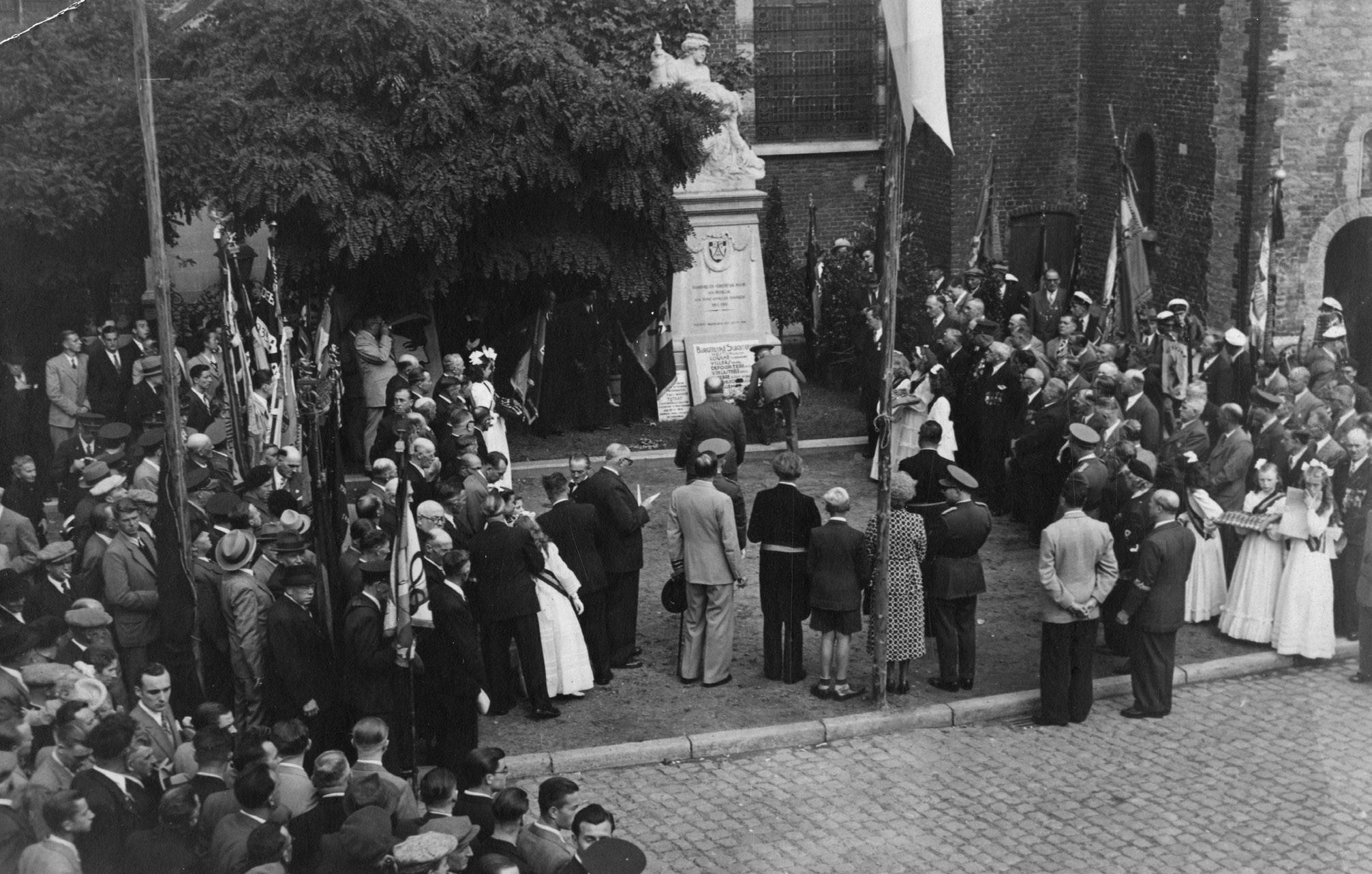 Herdenking van de bevrijding op 12 september 1948 aan het monument in het centrum. Mevr. Edmond Ameye en haar zoon Louis, staande voor de vlaggenmast, met links van hen schepen Leon Defraeye, maken deel uit de eregasten.