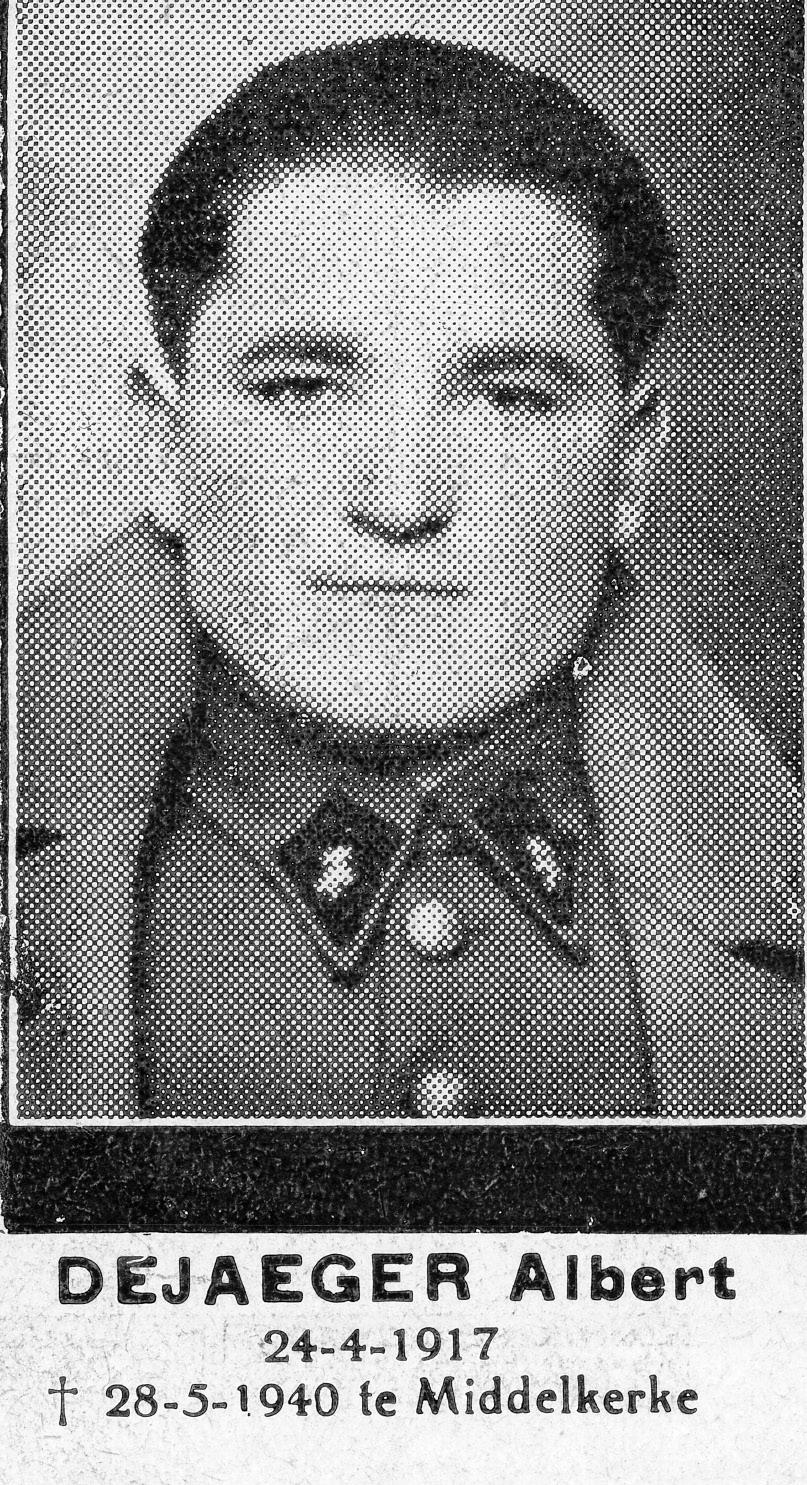 De laatste militair die bezweek was soldaat Albert Dejaeger (°1917) van het 2 e Bataljon Transmissietroepen. Weer eenzelfde scenario als bij Decock en Adams. Getroffen door bomscherven te Beernem overleed Albert de dag erna – op 28 mei – in een hospitaal in Middelkerke. Hij werd er begraven op de gemeentelijke begraafplaats. Enkele weken later bracht men het lichaam van de landbouwer over naar Deerlijk. Pas maanden later kwam aan het licht dat er een spijtige vergissing was gemaakt. In plaats van Albert was een andere gesneuvelde overgebracht naar Deerlijk. Na controle bleek het lichaam van Dejaeger nog te rusten in Middelkerke. Toch bleef het er begraven. In 1958 werd Albert alsnog verplaatst naar de Belgische Militaire Begraafplaats van De Panne.