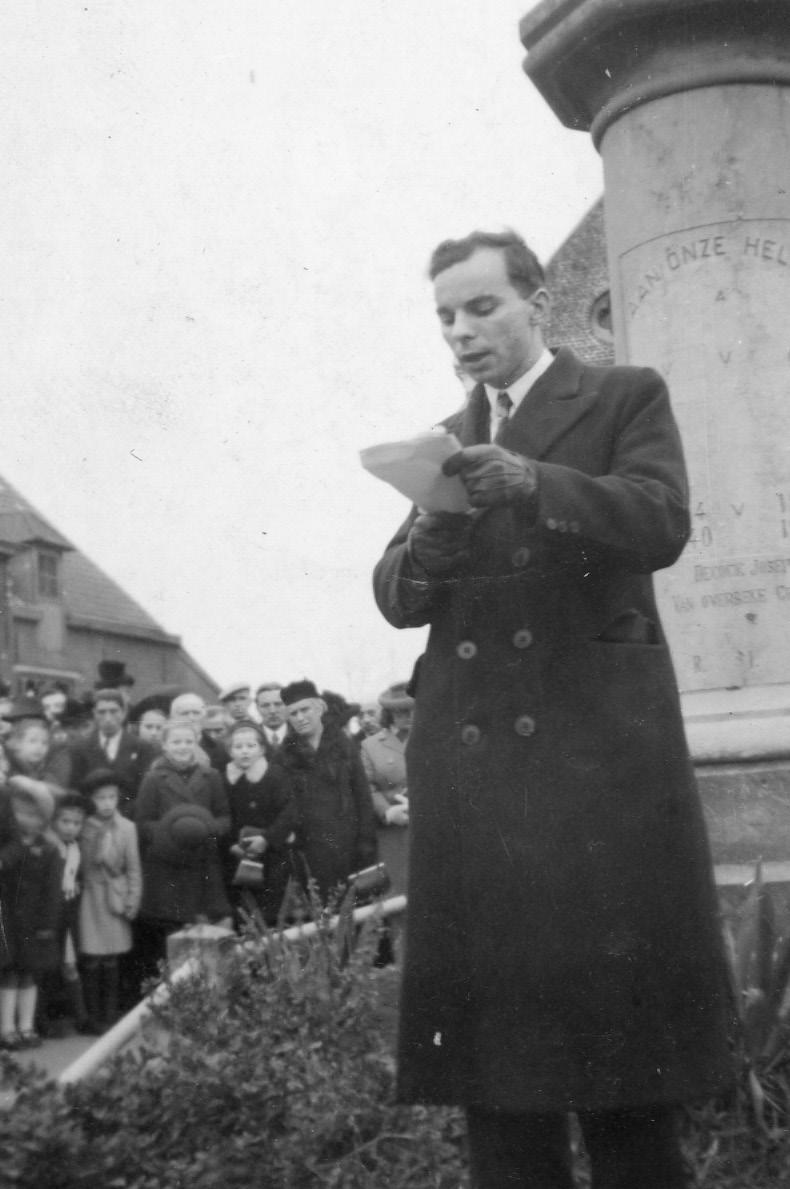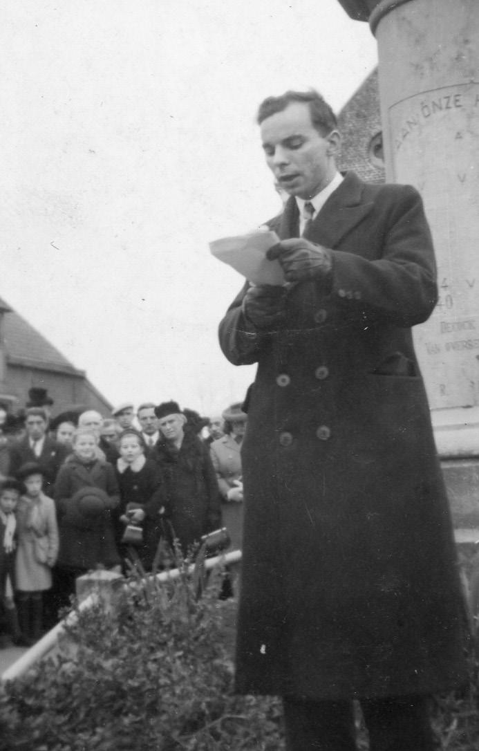 Sint-Lodewijk, 02 september 1945. Meester André Titeca houdt een toespraak na de plechtige inhuldiging van de aangepaste zuil van het gedenkteken.