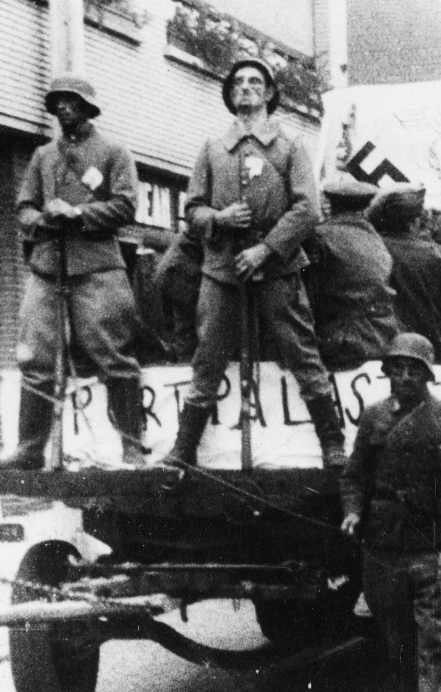 De bevrijdingsstoet van het centrum: in de Schoolstraat komt een wagen met voorop enkele ‘Duitsers’ voorbij de meubelzaak van Jan Degezelle.