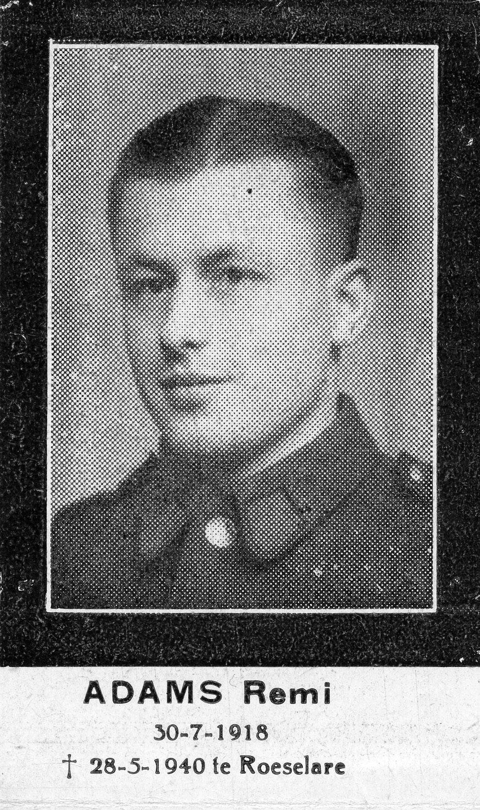 Soldaat-infirmier Remi Adams (°1918) stierf op 26 mei in gelijkaardige omstandigheden als Joseph Decock. Ook hij werd zwaar verwond door granaatscherven – in de omgeving van Oekene – en zou daags nadien ontslapen in een hospitaal in Roeselare. Remi was als milicien nog in het leger bij de Duitse inval en moest dus niet opgeroepen worden. Hij werd rechtstreeks vanuit het leger de strijd ingestuurd. Zijn eenheid was het 10 e Artillerieregiment. 2 dagen na zijn overlijden werd Remi begraven te Roeselare, op het ereperk voor de Roeselaarse oorlogsslachtoffers van de stedelijke begraafplaats in de Blekerijstraat. Hij was van beroep wever.