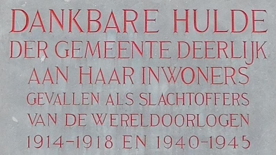 Deze verschrikkingen mogen nooit vergeten worden. Het gemeentebestuur en de N.S.B. afdeling Deerlijk blijven daarom - met medewerking van Heemkring Dorp en Toren vzw - jaarlijks inzetten op de herdenking van beide wereldoorlogen. 1 Bij bepaalde verjaardagen – zoals 100 jaar Eerste Wereldoorlog en nu 80 jaar einde Tweede