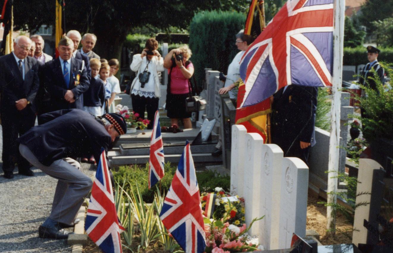 Foto onder 03 september 1994: Frank Cunningham legt bloemen op de graven van zijn 4 gesneuvelde makkers.