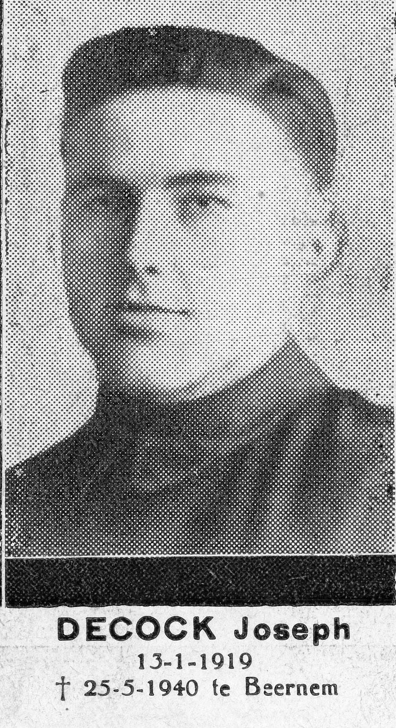 Op 25 mei overleed sergeant Joseph Decock (°1919) in een tot krijgshospitaal ingerichte school in Beernem. Hij was daags voordien ernstig verwond geraakt bij de inslag van een granaat. Op dat moment lag zijn regiment, het 2 e Linie, in verdediging aan het Schipdonkkanaal in Ronsele (later een deelgemeente van Zomergem dat intussen zelf deel uitmaakt van de fusiegemeente Lievegem). Joseph werd bijgezet op het gemeentekerkhof van Beernem. 3 weken later werd hij opnieuw ter aarde besteld op het kerkhof van Sint-Lodewijk, in het