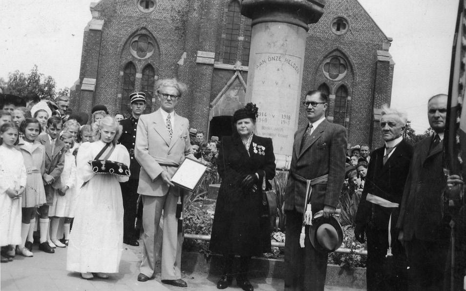 Voor het oorlogsmonument in Sint-Lodewijk op 13 juli 1947. Uitreiking van onder meer het Oorlogskruis 1940 met palm aan Silvia Pollet, moeder van de omgekomen sergeant Joseph Decock, door schepen Leon Defraeye (links) en burgemeester Joseph Vandekerckhove (rechts).