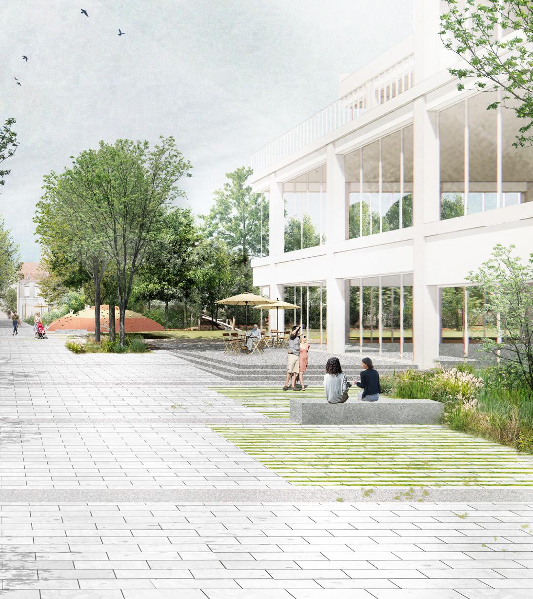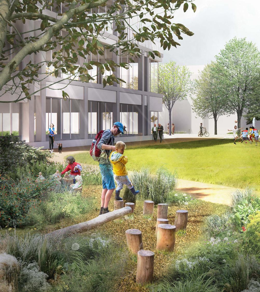 Op termijn realiseren we een centrumpark met maar liefst 4 duidelijke toegangswegen. We zorgen voor een goed evenwicht tussen een meer stedelijk programma langs de actieve strip en meer plaats voor groen, biodiversiteit en waterinfiltratie in het centrale park zelf. De 3D-tekening en het toekomstbeeld op de volgende pagina doen alvast dromen over het nieuwe centrumpark.