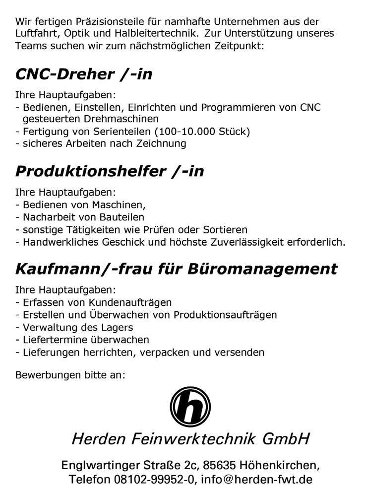 Herden Feinwerktechnik GmbH Fertigung von Präzisionsteilen für Firmen B., Englwartinger Str. 2c 99 952-0 aus Luftfahrt, Optik- und Halbleitertechnik