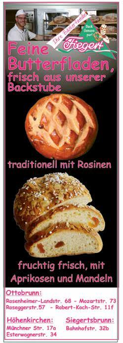 Bäckerei Fiegert 089 / 609 87 95 Münchner Str. 17a, Höhenkirchen, Tel.45 59 Brot- und Backwaren, Esterwagnerstr. 34, Höhenk., Tel. 78 58 45 Konditorei Bahnhofstr. 34, Siegertsbrunn, Tel. 45 86