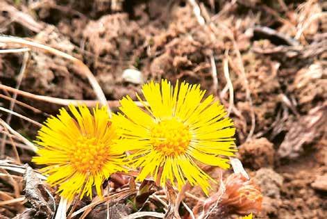 Auf unserem Spaziergang mit Ronja, Charlotte und Lola strahlen uns am Wegrand gelbe Frühlingsblümchen an: es ist der HUFLATTICH. Der Name kommt von den Blättern; die haben die Form von Hufen, er heißt auch ESELstappe.
