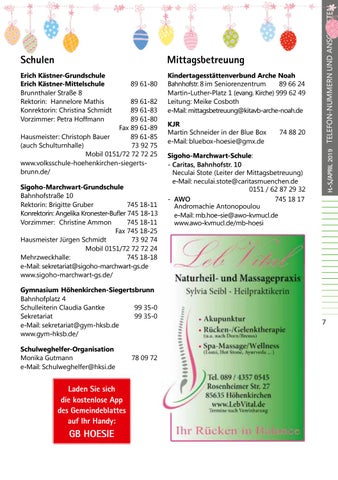 Sigoho-Marchwart-Grundschule Bahnhofstraße 10 Rektorin: Brigitte Gruber 745 18-11 Konrektorin: Angelika Kronester-Bufler 745 18-13 Vorzimmer: Christine Ammon 745 18-11 Fax 745 18-25 Hausmeister Jürgen Schmidt 73 92 74 Mobil 0151/72 72 72 24 Mehrzweckhalle: 745 18-18 e-Mail: sekretariat@sigoho-marchwart-gs.de www.sigoho-marchwart-gs.de/ Gymnasium Höhenkirchen-Siegertsbrunn Bahnhofplatz 4 Schulleiterin Claudia Gantke 99 35-0 Sekretariat 99 35-0 e-Mail: sekretariat@gym-hksb.de www.gym-hksb.de/ Schulweghelfer-Organisation Monika Gutmann e-Mail: Schulweghelfer@hksi.de