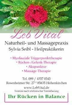 Heike Metzdorf Spezialisierte Physiotherapie www.heikemetzdorf.de 0171/848 26 94 Nicole Riedmair M.A. 892 11 80 Logopädie/Sprachtherapie/Lerntherapie Petra Vogel-Kern 78 48 47 Körperint. Psychotherapie,