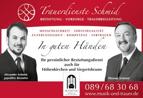 Hinweis: Die Redaktion behält sich Kürzungen der eingereichten Texte und die Auswahl der Fotos vor. Namentlich gekennzeichnete Beiträge geben die Meinung des Verfassers wieder. Für den Inhalt der Anzeigen wird keine Haftung übernommen. Ein Nachdruck, die Reproduktion und Vervielfältigung von Fotos und Anzeigen aus dem Gemeindeblatt – auch auszugsweise – sind verboten. Das Gemeindeblatt Höhenkirchen-Siegertsbrunn ist ein Druckerzeugnis im Sinne des Presserechts und kein offizielles Amtsblatt.