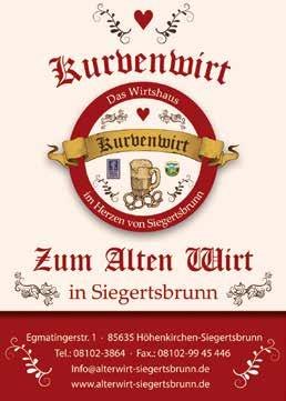 Ausgehen Firma, Adresse Tel. 08102- Beschreibung Alter Wirt Siegertsbrunn 38 64 Bayerisch bodenständige Küche Egmatinger Str. 1 Bäckerei Fiegert 45 59 Münchner Str. 17a, Höhenkirchen, Tel: 45 59 Brot- und Backwaren, Konditorei 089/609 87 95 Esterwagnerstr. 34, Höhenkirchen, Tel: 78 58 45 Bahnhofstr. 34, Siegertsbrunn, Tel: 45 86 Getränke Geissler 37 84 Getränke und Heimservice Esterwagnerstraße 1 Voglrieder Getränkemarkt 81 81 Fachgroßhandel für alkoholfreie Getränke, Bogenhauser Straße 8 Biere und Heimdienst