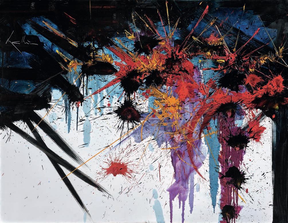 Kurs eingeschlagen. 2019 erlebte das Werk von Georges Mathieu ein spektakuläres Comeback, das von einer beispiellosen Allianz zwischen zwei Schwergewichten des Kunstmarkts getragen wurde: der Familie Nahmad, die als die einflussreichste Händlerdynastie unserer Zeit gilt und im Besitz einer schwindelerregend großen Privatsammlung ist, und Emmanuel Perrotin, eine wichtige Schlüsselfigur der zeitgenössischen Kunstszene, der zwölf Galerien auf drei Kontinenten leitet. Beide, Nahmad und Perrotin, entwickelten gemeinsam eine Strategie, um die Kunst Georges Mathieus international neu zu positionieren – ähnlich wie dies die Galerie-Riesen Gagosian, Zwirner oder Pace tun. Den Auftakt bildete eine Ausstellung bei Nahmad Contemporary in New York, wo vier Hauptwerke von Georges Mathieu aus den späten 1970er-Jahren gezeigt wurden. Es folgte ein unerwarteter Triumph: Zwei Gemälde wurden von Richard Prince für die 2019er-Ausstellung „Artistic License“ im New Yorker Solomon R. Guggenheim Museum ausgewählt. Daraufhin gab es auf der Frieze Masters in London einen Stand, der alleinig Georges Mathieu gewidmet war und der von Perrotin und Nahmad Contemporary gemeinsam betreut wurde – mit Mathieus musealen Werken und begeistertem Pressefeedback. Diese koordinierte Offensive trug schnell Früchte. Zwischen 2019 und 2021 verdoppelten sich die Auktionsverkäufe für Werke von Mathieu von acht auf 16 Millionen Dol-