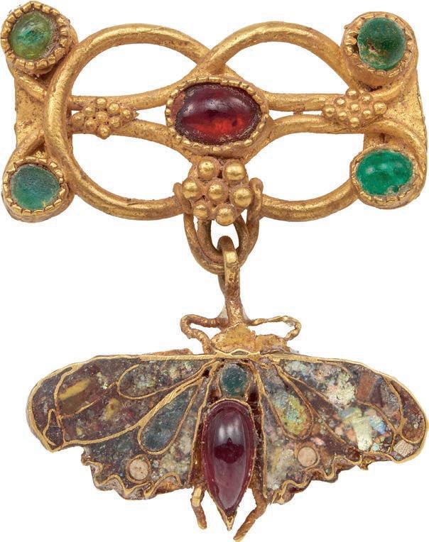 hänger (3.-2. Jh. v. Chr.) besteht aus zwei Teilen, die ursprünglich wohl nicht zusammengehörten. An einem als Heraklesknoten ausgeformten Kettenglied hängt ein Schmetterling. Das aus Golddraht verschlungene Element mit volutenförmig ausgebildeten Ecken und einem querovalen Almandincabochon in der Mitte wird als Heraklesknoten bezeichnet, ein gleicher Stein bildet den Körper des Insekts. Dieser Knoten war in der Antike ein beliebtes Schmuckmotiv, ihm wurden bestimmte Heilkräfte sowie die Fähigkeit zugesprochen, den bösen Blick abzuwenden. Zur Römerzeit war er Teil verschiedener Hochzeitsbräuche, da er als Symbol einer starken und dauerhaften Bildung galt. Die Etrusker haben auf dem Gebiet der Goldschmiedekunst außergewöhnliche Leistungen vollbracht, am bekanntesten ist die Granulation. Bei dieser Technik werden oft mikroskopisch kleine Goldkügelchen als Zierelemente auf eine goldene Unterlage aufgeschweißt. Im römischen