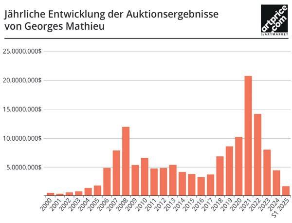 lar, mit Rekorden von über zwei Millionen Dollar. Konkret: 2,23 Millionen Dollar bei Christie’s im Jahr 2020 und 2,3 Millionen Dollar bei Sotheby’s im Jahr 2021 für monumentale Gemälde von sechs Metern Länge. Diese Zuschläge erfolgten in Hongkong. Ein deutliches Zeichen für das Interesse asiatischer Sammelnder. Georges Mathieus Werke begeistern weit über die Grenzen Europas hinaus in Peking, Tokio, Shanghai, Singapur und Seoul (dort gab es eine Ausstellung in der koreanischen Zweigstelle von Perrotin im Jahr 2024). Nach Asien wurde Georges Mathieu aber auch in New York gefeiert. Im November 2022 verzeichnete Sotheby’s mit dem Verkauf von „Camp de Carthage“ von 1951 für 1,4 Millionen Dollar (gegenüber einem hohen Schätzwert von 600.000 Dollar) den ersten Verkauf eines Mathieu-Werks auf amerikanischem Boden in Millionenhöhe. Ein symbolischer Meilenstein für ein Werk eines Künstlers, den Clement Greenberg, der einflussreiche Kritiker des amerikanischen Abstrakten Expressionismus, einst als „unumgängliche europäische Figur“ bezeichnete. Seit diesem Durchbruch ist die Begeisterung jedoch wieder abgeflaut . Ebenso wie der globale Markt schrumpft auch derjenige für Mathieu. Es gibt immer weniger bedeutende seiner Werke, und die Auktionen verlieren an Schwung. Am 11. April 2025, am Tag der Eröffnung der großen Pariser Ausstellung, die ihm die Monnaie de Paris gewidmet hatte, veräußerte Christie’s „Crissay“ von 1969, ein mittelgroßes Gemälde, das für 71.250 Dollar verkauft wurde –ein maßvoller Preis, weit entfernt von den 100.000 oder 140.000 Dollar, die für ähnliche Werke wie „Asphodèle“ oder „Quanta Mina“ drei Jahre zuvor noch erzielt werden konnten. Der Schwung hat nachgelassen, die Nachfrage ist abgeflacht. Nach dem von den Marktriesen organisierten Hype hat sich die Aufregung gelegt. Aber Georges Mathieus Geschichte mit dem Kunstmarkt ist wahrscheinlich noch nicht auserzählt.