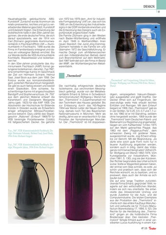 DESIGN 15 Haushaltsgeräte gebräuchliche ABSKunststoff. Zunächst wurde Aluminium als relativ preiswertes, leichtes und gut zu verarbeitendes Material geschätzt, Kunststoff und Edelstahl folgten. Die Entwicklung der Isoliertechnik hatte in den 20er-Jahren begonnen, die erste deutsche Firma, die sich darauf spezialisierte, war die 1914 von Carl Zitzmann gegründete Aluminiumwarenfabrik in Fischbach/Rhön (Alfi = Aluminiumfabrik in Fischbach). 1948 wurde die Firma im Familienbesitz enteignet und daraus ein volkseigner Betrieb errichtet. Bis zur Wende stellte die VEB Aluminiumfabrik Kochtöpfe, Wasserkessel und Isolierkannen her. In den 50er-Jahren produzierte das Aluminiumwerk Fischbach (AWF) formal gelungene Isolierkannen, darunter „Typ 760", eine birnenförmige Kanne im Geschmack der Zeit von Hermann Schrank, Helmut Saal, Josef Bock aus dem Jahr 1956. Der Korpus wurde aus korrosionsbeständigem, poliertem Reinaluminium hergestellt. Sie gibt es auch farbig eloxiert und besitzt einen Glaskolben. Eine schlanke, flaschenförmige Kanne mit angeschraubtem Bandgriff und Stopfenverschluss „Nr. 750” aus dem gleichen Material entwarf die Keramikerin und Designerin Margarete Jahny (geb. 1923) für das AWF 1958. Die Absolventin der Hochschule für Bildende Künste in Dresden wurde als Entwerferin einiger erfolgreicher Mitropa-Porzellanservice bekannt. Dazu zählte das Stapelgeschirr „Rationell” (Entwurf 1969/79 für VEB Vereinigte Porzellanwerke Colditz) mit fallgesichertem Deckel. Sie gehörte Typ „760", VEB Aluminiumfabrik Fischbach, Design: Hermann Schrank, Helmut Saal, Josef Bock, 1956 (Foto: Richard Anger) Typ „750", VEB Aluminiumfabrik Fischbach, Design: Margarete Jahny, 1958 (Foto: Richard Anger)