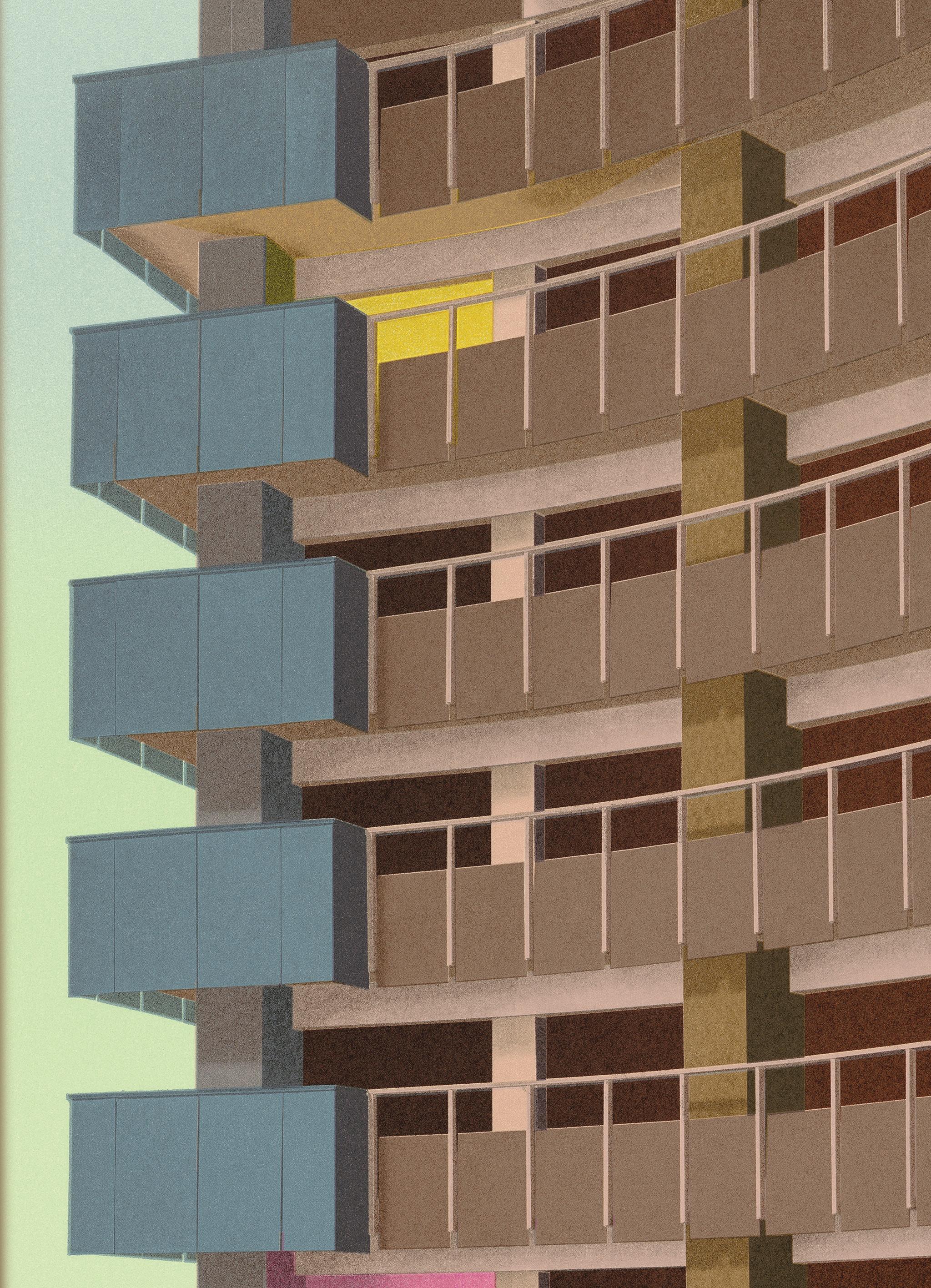 is picture is a recreation of the façade of the modest Reykjavik apartment building, designed in 1973 by Ormar Þór Guðmundsson & Örnólfur Hall, where Fischer passed the last three years of his life. In the preceding years he had kept a low pro le, moving between Los Angeles, Pasadena, Budapest, the Philippines, and possibly Switzerland. While he had walked away from the 1972 championship with a prize of $250,000— an astonishing sum of money in chess at that time—rumors had it that he was soon destitute, living in ophouses.