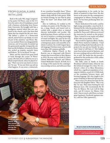 200 compositions to his credit, he has plenty of material to draw from. He also serves as the pastor for the contemporary congregation at Asbury. During the pandemic, he has been producing these services online. Flores’ dedication to his work—and his high-energy personality—may best be illustrated by the video he produced for his song “Agradacimiento” (“Gratitude”). He traveled to Texas and California to record the musicians he wanted on the project. “Then, I mixed it in my studio and edited all the video in my studio,” he says. That would be Qantares Music Studio, which Flores started in California. “I had a little recording studio basically just to do projects for me and my friends,” he says, “and I kind of still have it.” He’s helped some local artists record at Qantares, and he’s now working with an artist from Austin, as well. The studio has also proved a godsend for the production of the online contemporary services. His skills came in handy at South Broadway Cultural Center, where he was the technical manager for a time. He conducted a choir at La Mesa Elementary, which has a significant population of immigrant children, as part of a UNM study on the correlation between music and learning language. He’s also taught in the guitar workshop at Mariachi Spectacular. Busy as he is, he always has time for his four-year-old daughter Olivia. “She is my life,” he says. They enjoy hunting for real Mexican tacos. (He recommends the El Taco de Mexico, The Last Call for Baja style, and El Cotorro for Mexico City style.) Stay in touch with Flores on Instagram (qantares), Facebook (qantares music), and You Tube (qantares1).