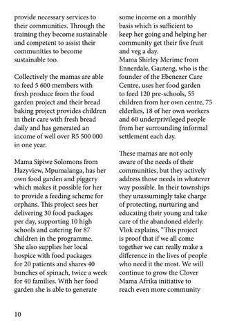 some income on a monthly basis which is sufficient to keep her going and helping her community get their five fruit and veg a day. Mama Shirley Merime from Ennerdale, Gauteng, who is the founder of the Ebenezer Care Centre, uses her food garden to feed 120 pre-schools, 55 children from her own centre, 75 elderlies, 18 of her own workers and 60 underprivileged people from her surrounding informal settlement each day. These mamas are not only aware of the needs of their communities, but they actively address those needs in whatever way possible. In their townships they unassumingly take charge of protecting, nurturing and educating their young and take care of the abandoned elderly. Vlok explains, “This project is proof that if we all come together we can really make a difference in the lives of people who need it the most. We will continue to grow the Clover Mama Afrika initiative to reach even more community