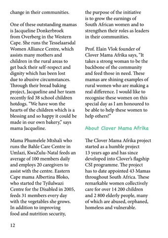 the purpose of the initiative is to grow the earnings of South African women and to strengthen their roles as leaders in their communities. Prof. Elain Vlok founder of Clover Mama Afrika says, “It takes a strong woman to be the backbone of the community and feed those in need. These mamas are shining examples of rural women who are making a real difference. I would like to recognise these women on this special day as I am honoured to be able to help these women to help others!” About Clover Mama Afrika The Clover Mama Afrika project started as a humble project 13 years ago and has since developed into Clover’s flagship CSI programme. The project has to date appointed 43 Mamas throughout South Africa. These remarkable women collectively care for over 14 200 children and 2 800 elderly people, many of which are abused, orphaned, homeless and vulnerable.