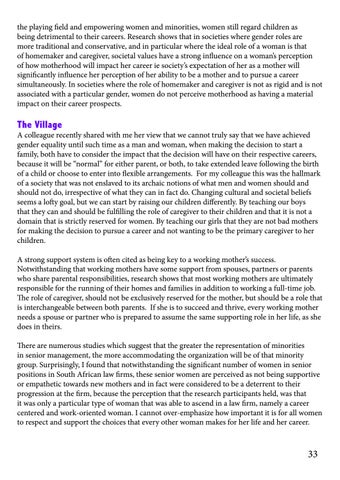 the playing field and empowering women and minorities, women still regard children as being detrimental to their careers. Research shows that in societies where gender roles are more traditional and conservative, and in particular where the ideal role of a woman is that of homemaker and caregiver, societal values have a strong influence on a woman’s perception of how motherhood will impact her career ie society’s expectation of her as a mother will significantly influence her perception of her ability to be a mother and to pursue a career simultaneously. In societies where the role of homemaker and caregiver is not as rigid and is not associated with a particular gender, women do not perceive motherhood as having a material impact on their career prospects.